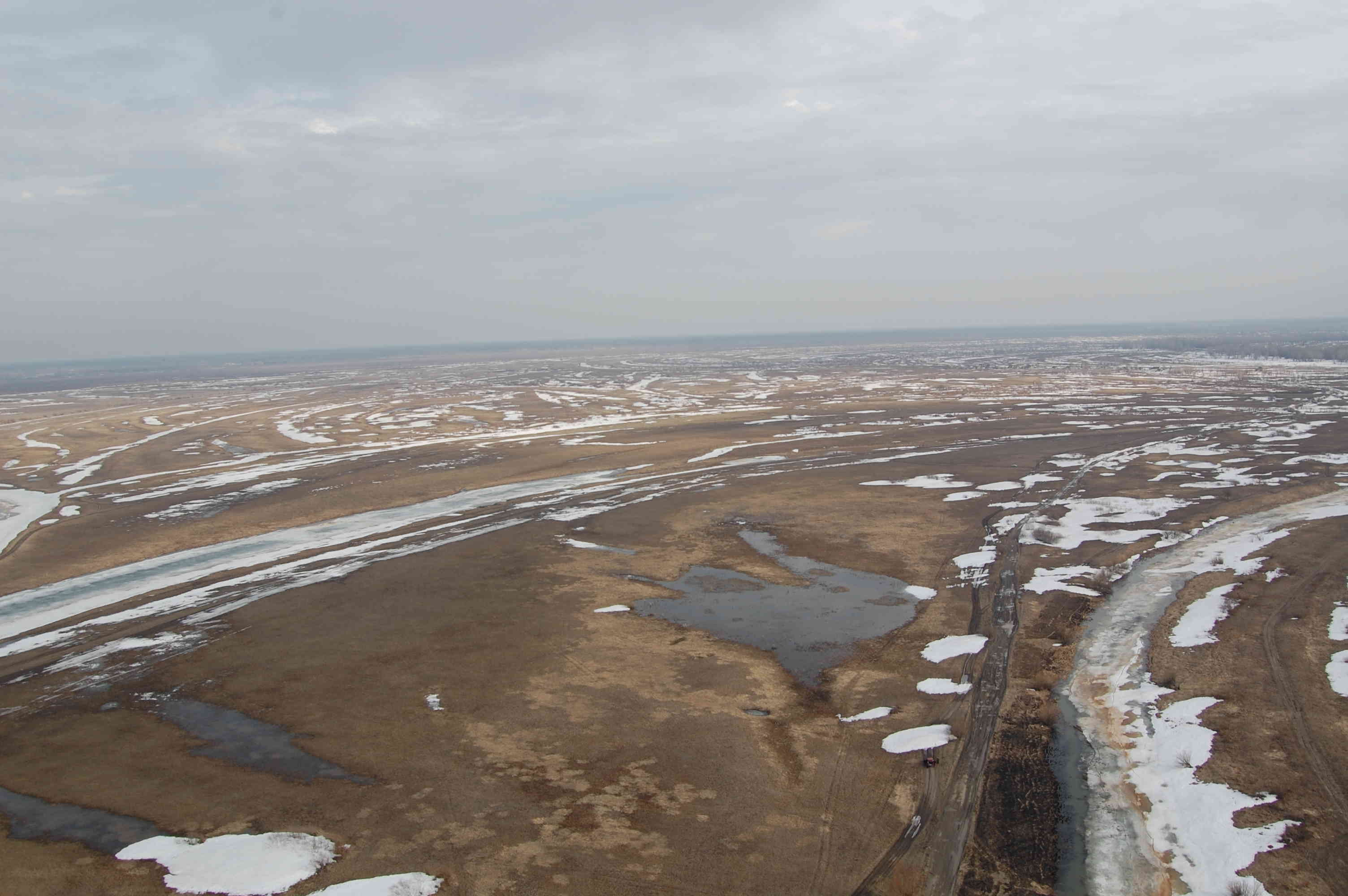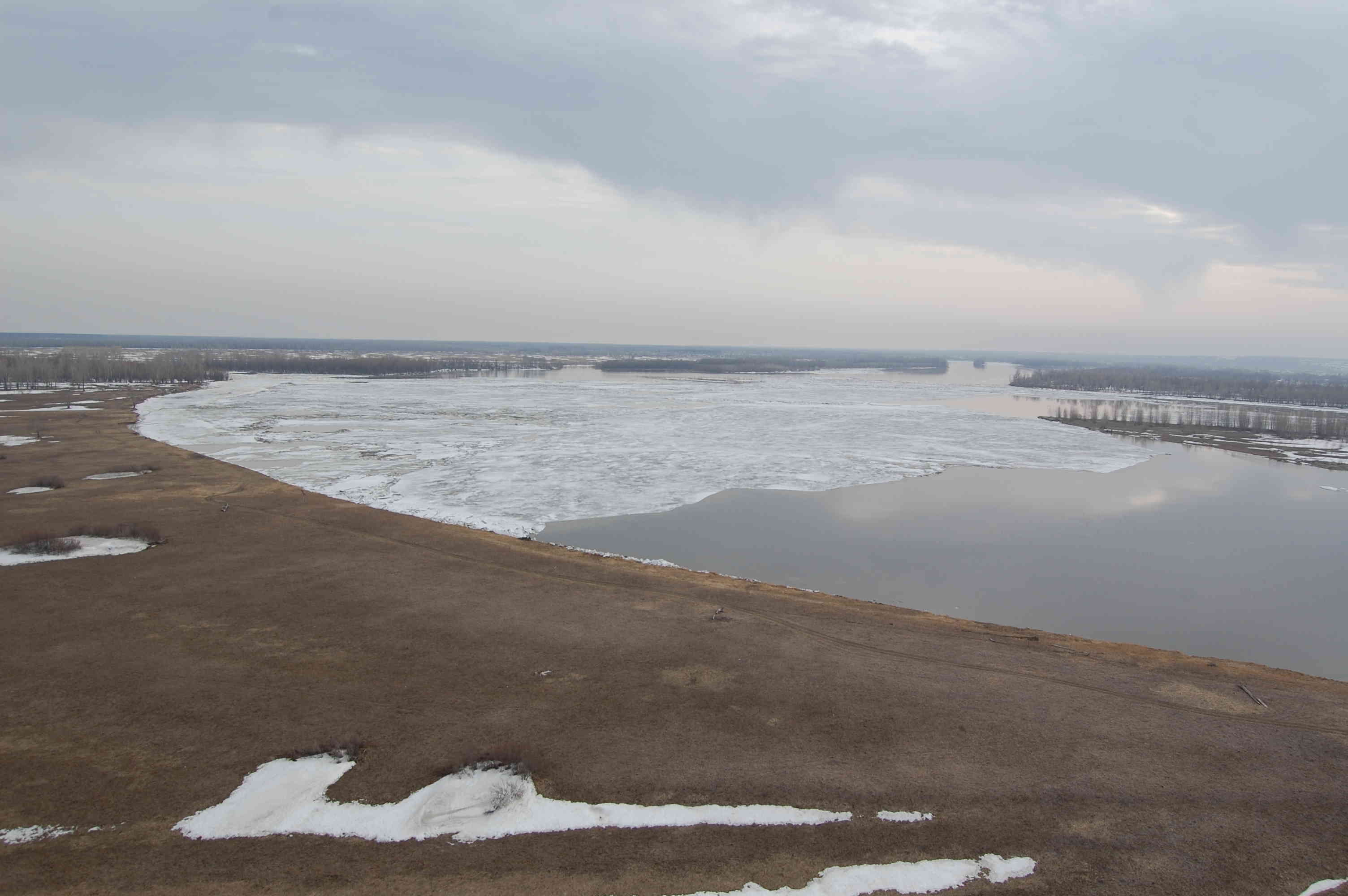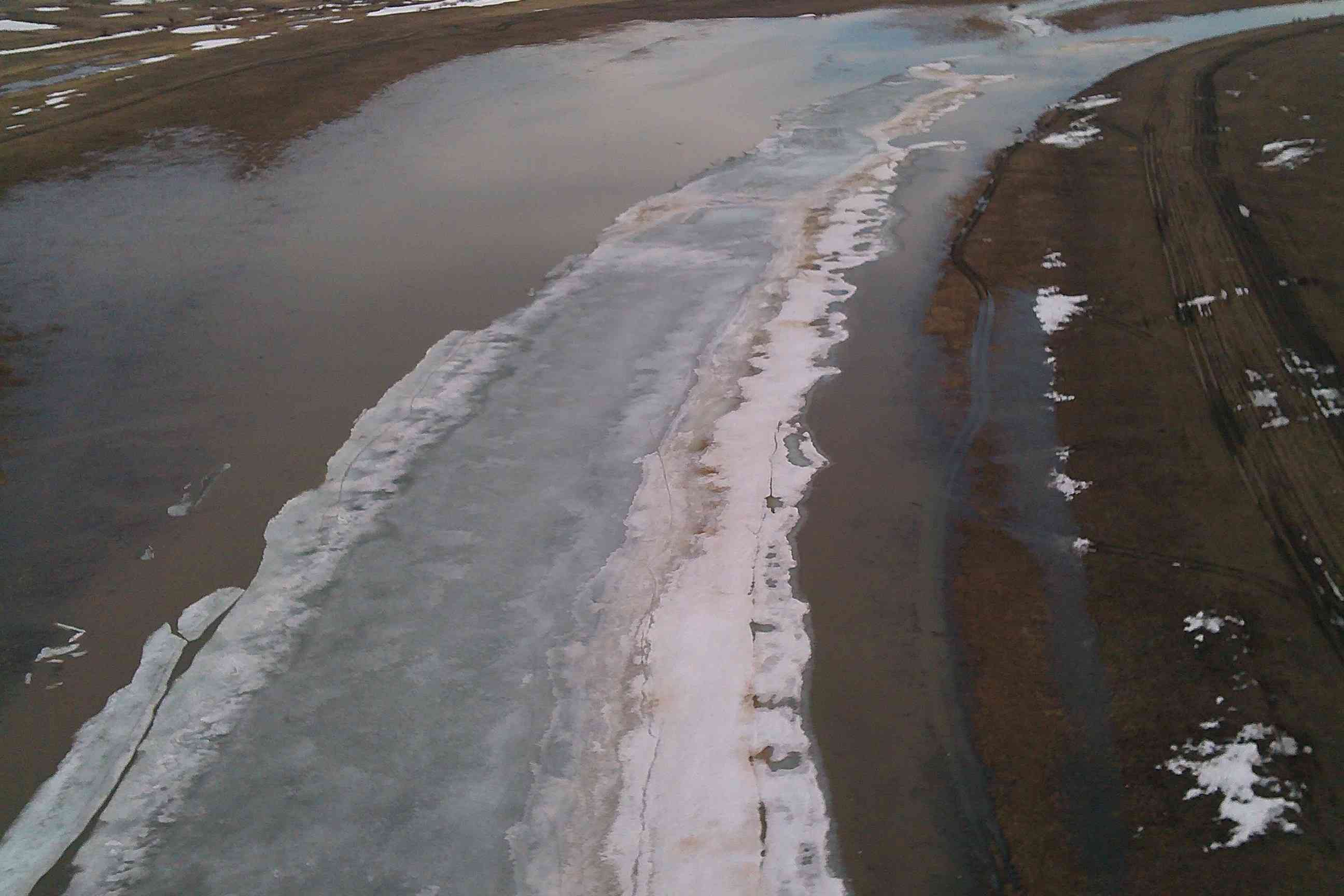 Начался подъем воды, протоки выходят и своих берегов, но лед еще держится.