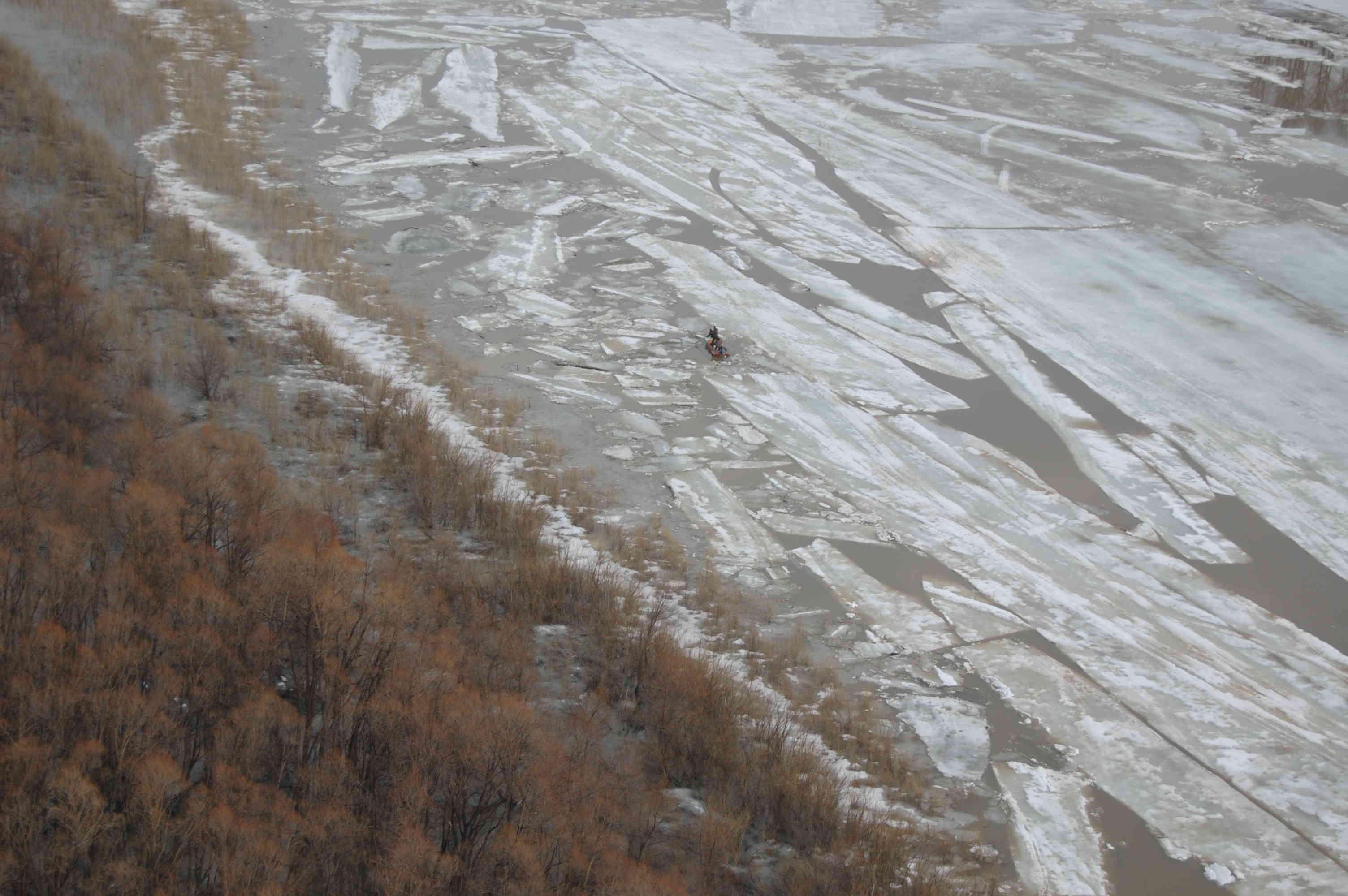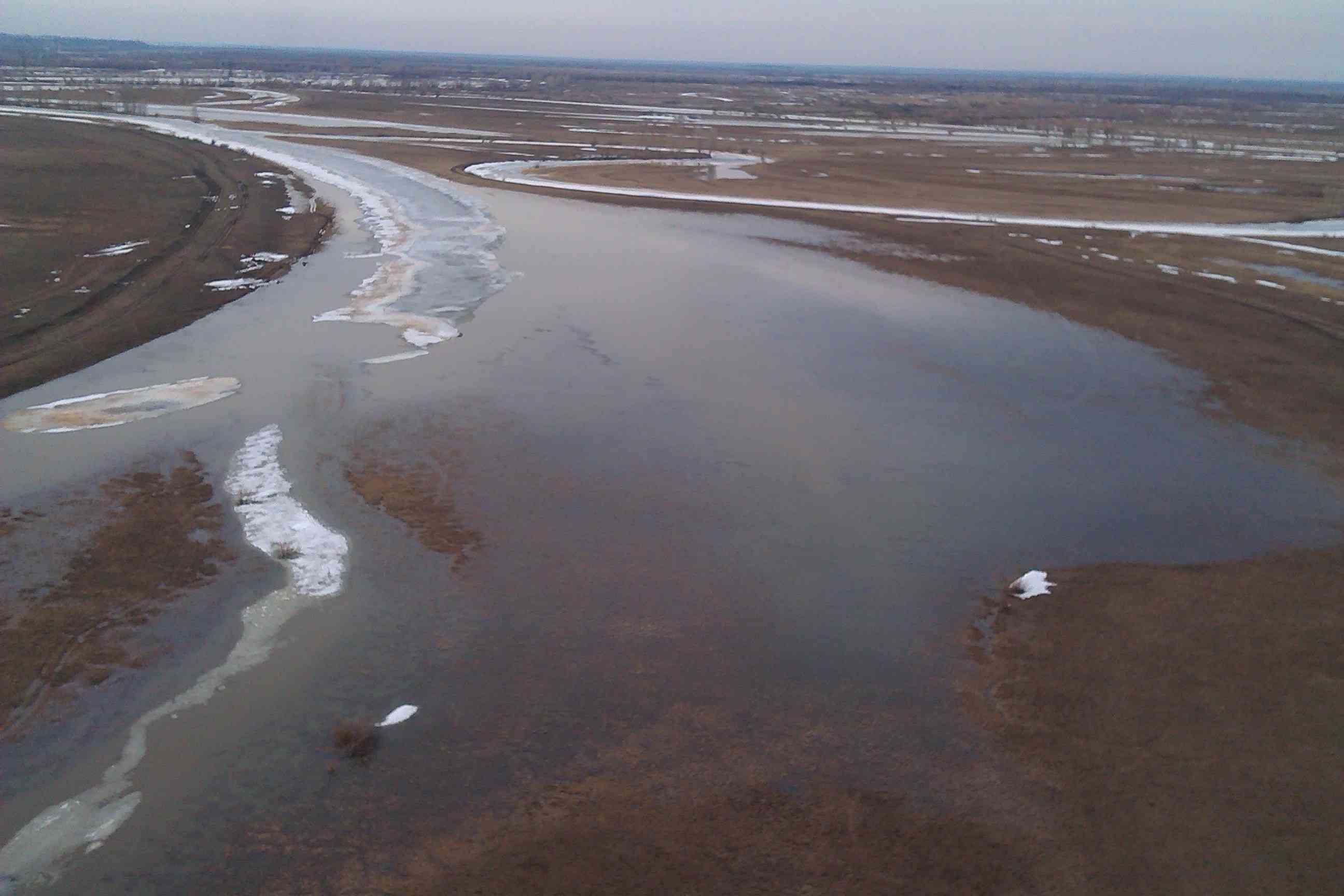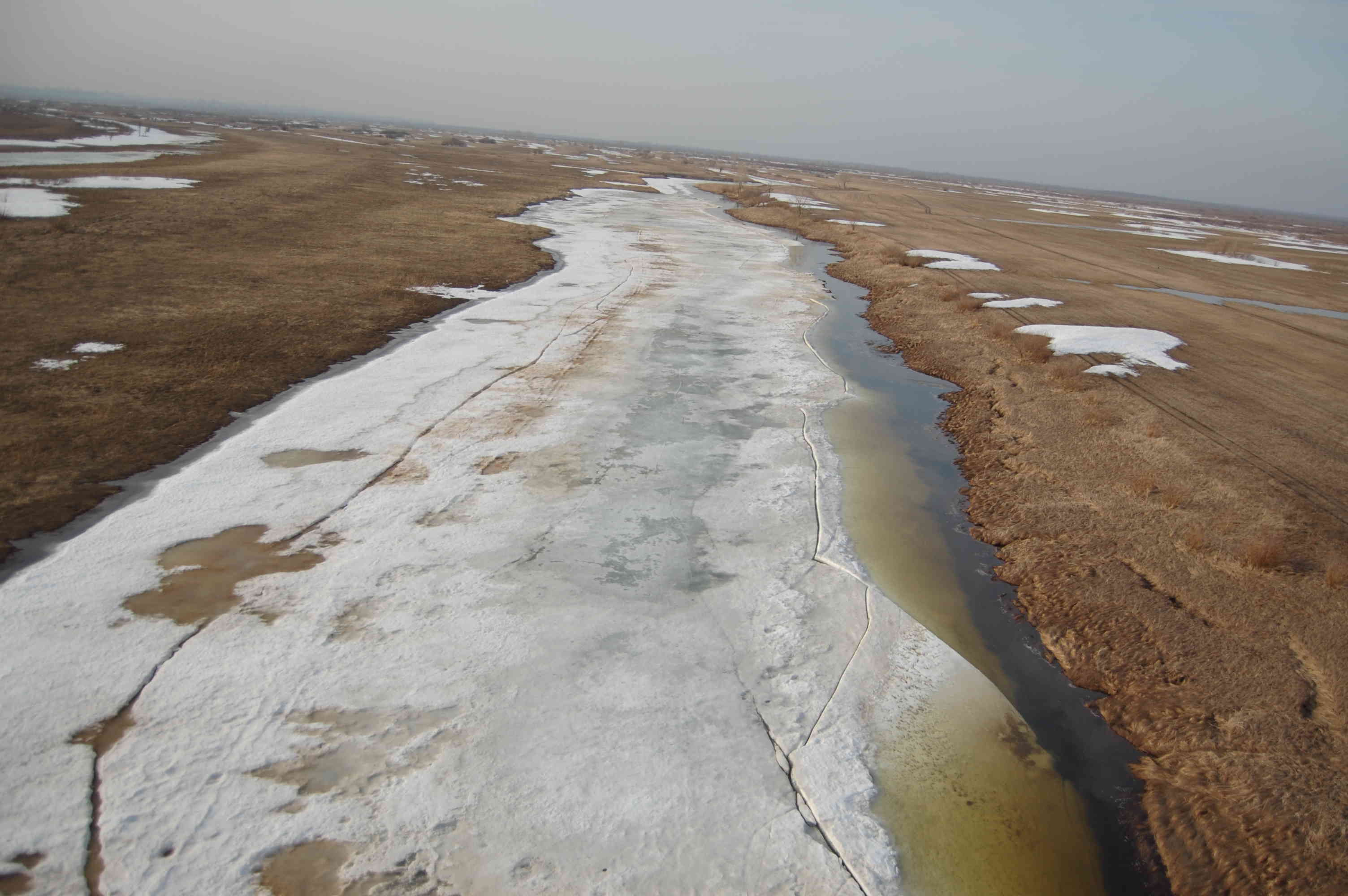 Начался подъем воды, протоки выходят и своих берегов, но лед еще держится.