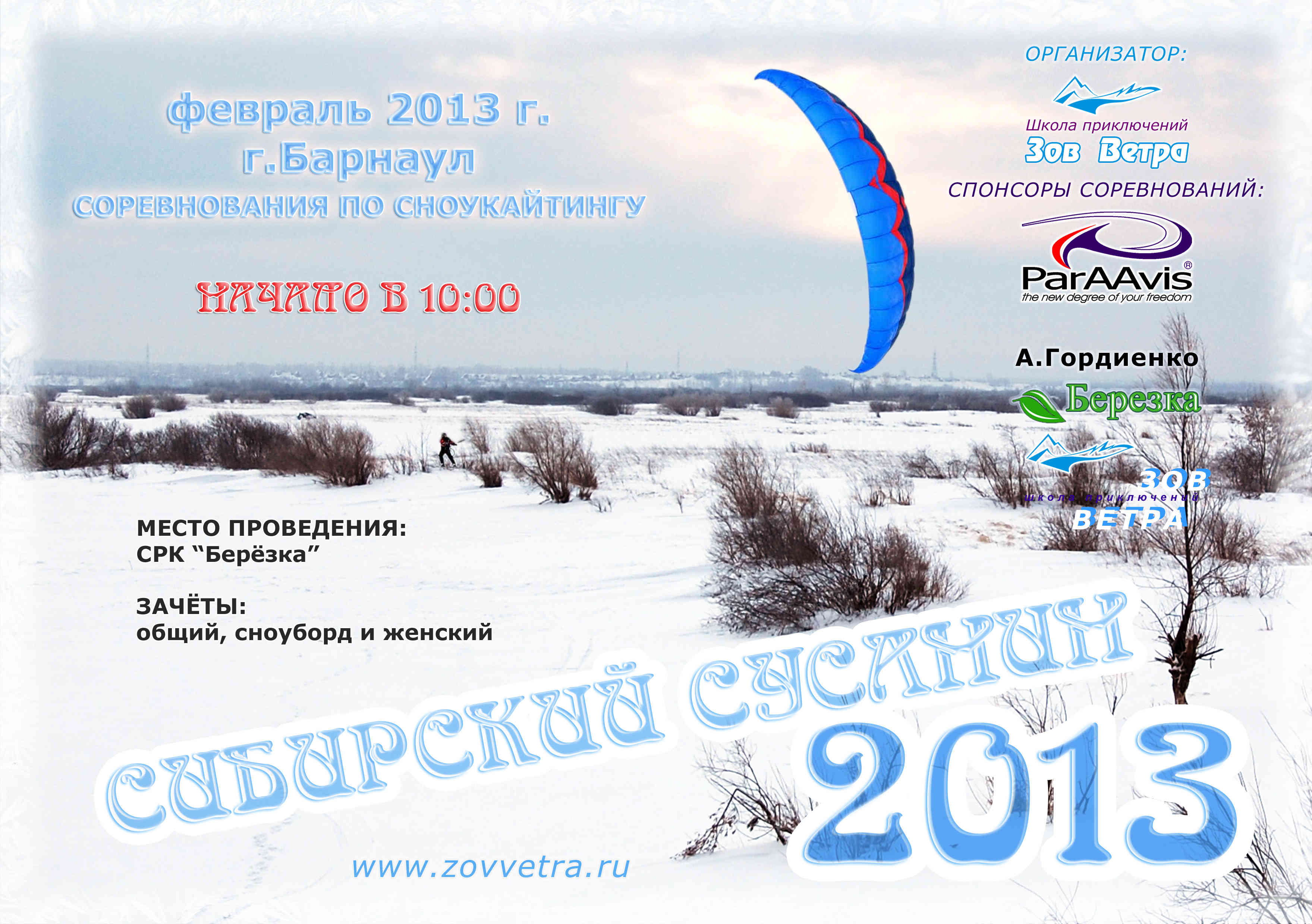 4. Дисциплины и зачеты: соревнования по зимнему кайтингу проводятся в дисциплине «Сибирский Сусанин» в двух зачетах: общий и женский и состоят из максимум 3-х гонок, минимум 1-й гонки. Соревнование считается состоявшимся при участии не менее 3-х спортсменов в каждом зачете и проведении не менее 1-й гонки .