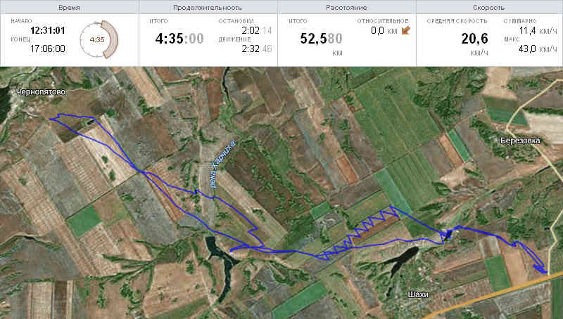 И вот, 5 января 2015 года все эти условия, с небольшими отклонениями, сложились воедино. Ветер 3.2-3.8 м/с, порывы до 9-10 м/с, направление ЮЮЗ, температура -12...-10°С, без осадков. Вместо 10 часов утра, с Берёзки мы выехали в 11:25 и полным бакштагом умчались за первую лесополосу. Пересекли озеро с вторым знаком и, без труда преодолев две ЛЭП, выкатились за Шахи, где почувствовалось усиление ветра так, что триммер пришлось затянуть на больше половины. Здесь же выяснились и новые обстоятельства нового маршрута - на космоснимках я просмотрел две ЛЭП, которые в реальности добавлялись к трём уже известным. Дело осложнялось малым пространством для маневров, усилением ветра и курсом прохождения ЛЭП. Я оказался зажатым между проводами на ветре и околком с под ветра, которые тянулись вдоль курса левым галсом. Пройти провода правым галсом казалось ещё труднее из-за курса прохождения относительно ЛЭП и стоящей за ней лесополосой. К тому же дальше по ходу моего движения линия сворачивала и уходила на северо-запад, что позволяло пройти её левым галсом в бейдевинд практически поперёк. Правда за ней почти сразу находилась вторая ЛЭП высоковольтная, и вариантов вырисовывалось два - либо пройти ходом сразу две, либо успеть остановиться, чтобы сменить галс и пройти ВЛЭП вторым ходом чуть выше по ветру. И так и так подразумевался экспромт, а шутить с проводами совсем не хотелось, поэтому считаю этот отрезок пути самым напряжённым. Жизнь показала, что одним ходом обе ЛЭП пройти не удаётся. Форсирую первую на скорости 30 км/ч, с каждым пройденным метром скорость нарастает, привестись к ветру и сбросить скорость не даёт наветренная опора ЛЭП, и допустить уваливание под ветер тоже нельзя, при этом купол либо уже подстропная или стропы врезались бы в другую опору. Поэтому "контроль" за скоростью был отдан спинному мозгу, а основной работал над курсом, положением купола и дальнейшим развитием событий. Под проводами стало ясно, что долго я так не протяну, работать триммером, сбрасывая тягу и приводиться на ветер времени нет - вторая ЛЭП на подходе, уваливаться и проходить высоковольтку галфвиндом, а то и бакштагом означало продолжение увеличения скорости, а при таких курсах я не успевал остановиться и прямиком врезался бы в рощицу или улетел в тупик, выбираться из которого тоже не сахар, но хуже всего этого - там опять провода. В связи с этим принимаю решение останавливаться - сразу после ЛЭП направляю купол в зенит, давлю телом в Землю, упираюсь лыжами так, чтобы исключить полёт и торможу всем - и тушкой и кайтом и мыслями. Где я остановился, хорошо видно на треке. Затем иду правым галсом на ветер, меняю галс и вторым ходом спокойно прохожу ВЛЭП. Где-то на этом отрезке нашего путешествия, мной была достигнута скорость 52 км/ч. Тем временем Алексей проходил всё тоже самое, но выше по ветру и, по-моему, у него это происходило не так драматично. После успешного прохождения четырёх ЛЭП, мы устроили привал под лесополосой, чтобы перевести дух, отдохнуть и узнать наше точное местоположение, заглянув в фотоаппарат.