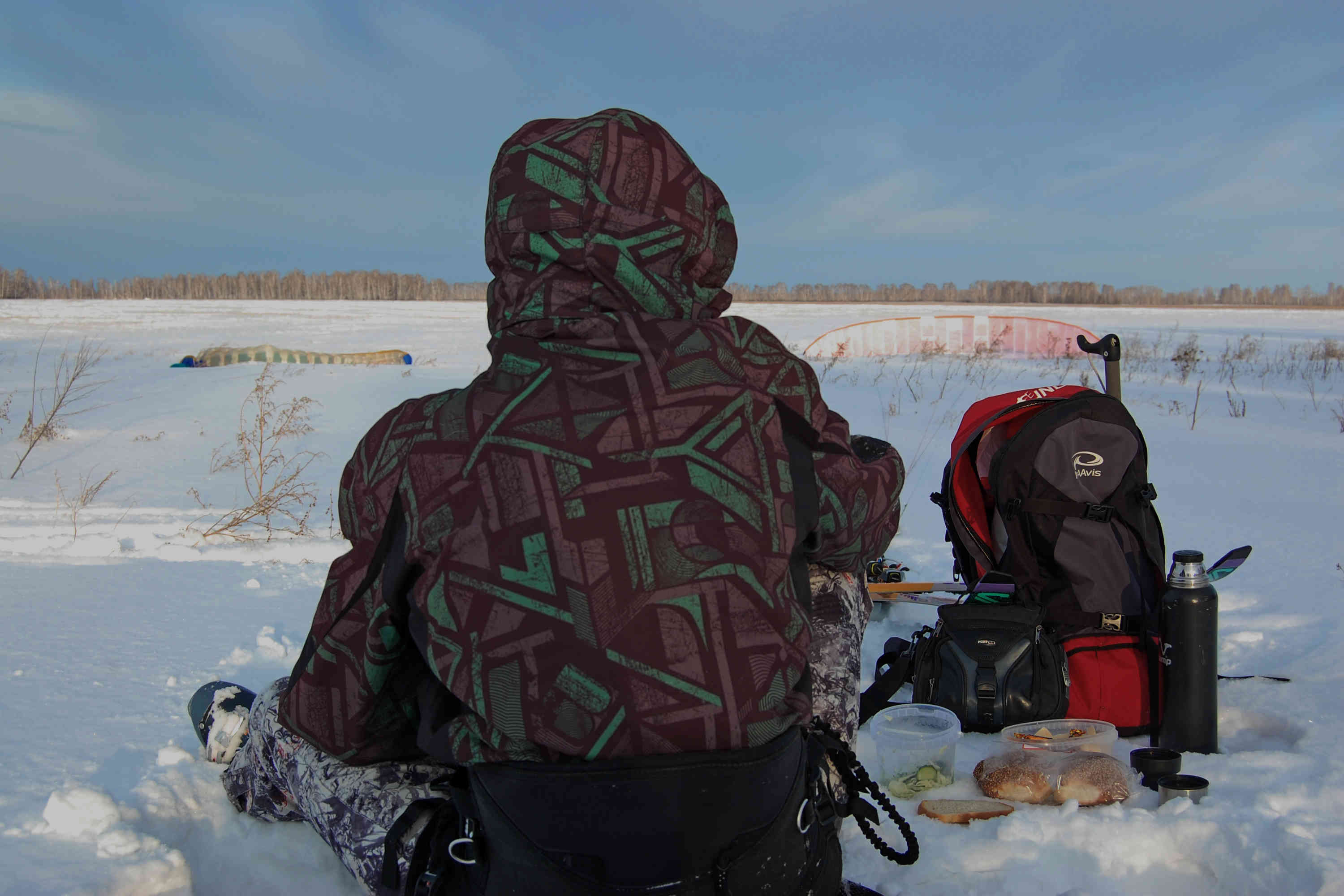 Пройдя по рейду и услышав лай собак, мы поняли, что цель достигнута, пора перекусить и отдохнуть. Место для обеда я выбрал ещё дома по карте - возле искусственного водохранилища. Здесь сделан земляной вал и удачным образом растут деревья, образуя небольшую рощицу, за которыми легко укрыться от ветра и кайты на парковке лежат спокойно и вид на Чернопятово радует глаз. Обед начался в 14:20 и продлился пол часа. После чего, сытые и отдохнувшие, махнув на прощание кайтами Чернопятовцам мы отправились в обратный путь.