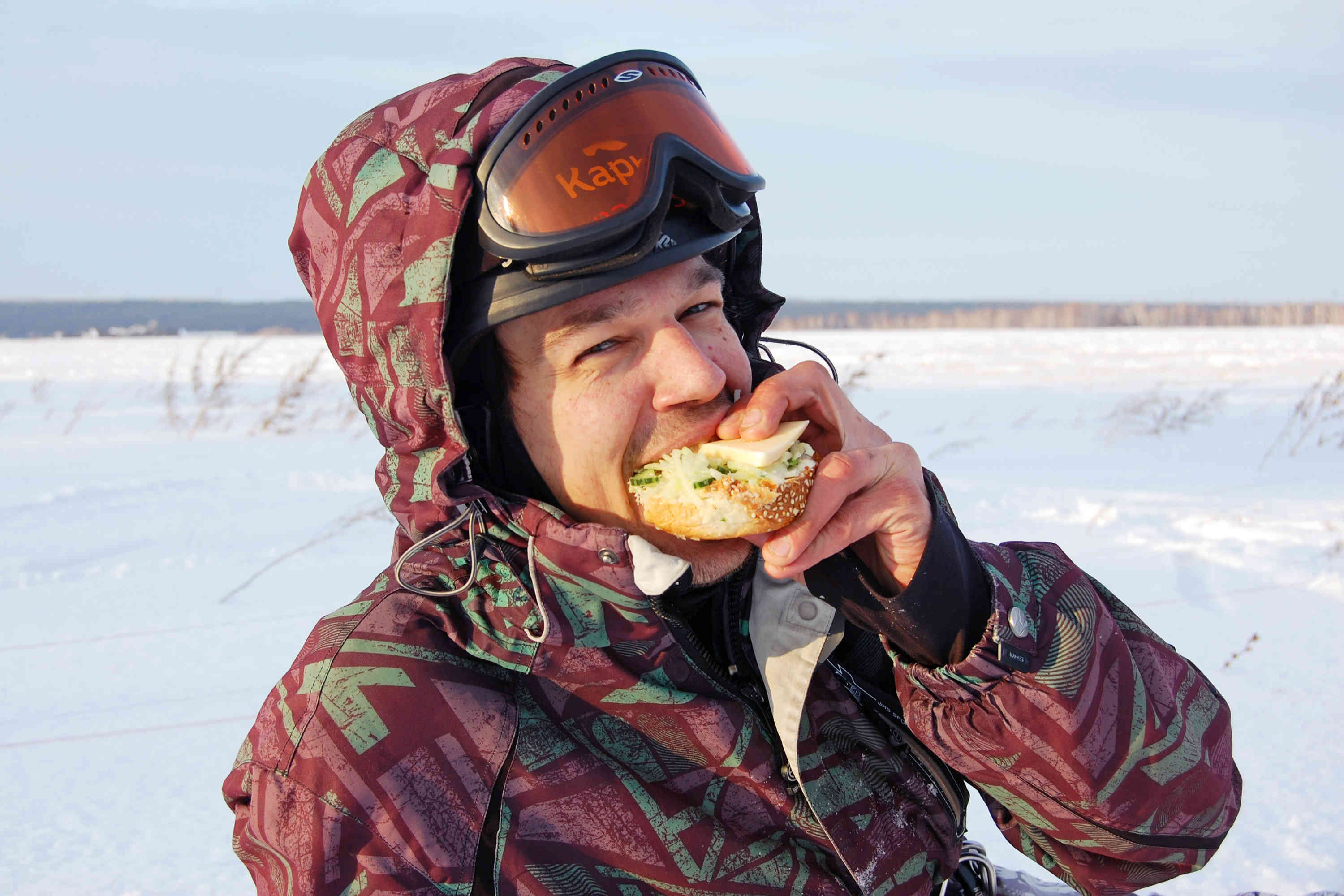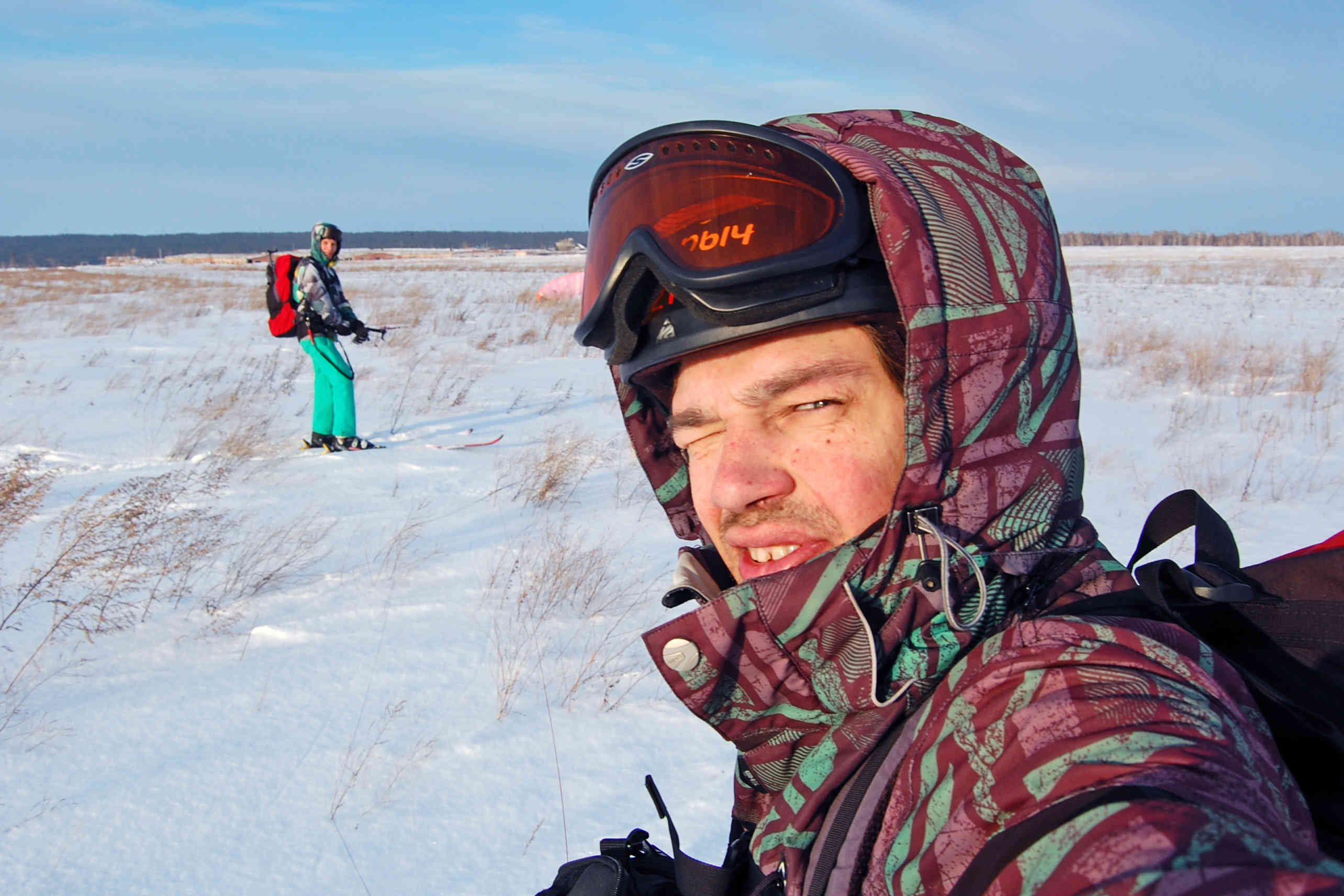 Затарившись едой чуть серьёзнее обычного - вместо двух сухарей, взял три - и забрав Карыча с его только что отутюженными лыжами, мы прибыли на Берёзку, откуда в 12:30 взяли курс на Чернопятово. Пол первого - это не то, чтобы рано, как планировалось, но внутренне чувство твёрдо убеждало, что времени на обратную дорогу больше, чем достаточно. Ничто не напоминало о крайнем визите десятимесячной давности этой деревни, из которой нас эвакуировал Михаил, так как накрытые быстро сгущавшимися сумерками, мы не смогли вернуться обратно. Но сейчас всё по другому. Так, уходя каждым галсом в лавировку и преодолев по пути три ЛЭП и две лесополосы, уже через час мы пили чай с конфетками на берегу оз. Харьково. На участке пути, когда проходили Шахи наблюдали позёмку. Ветер очень кстати усилился, так как на поле, по которому мы шли лежал пухляк и со слабым ветром там можно помучиться. Также это поле отметилось редко торчащими сухими подсолнухами, напомнив об адской для кайто-лыжника поляне с не убранным подсолнечником из прошлой поездки. Как говорится - знал бы, ракушку бы одел!