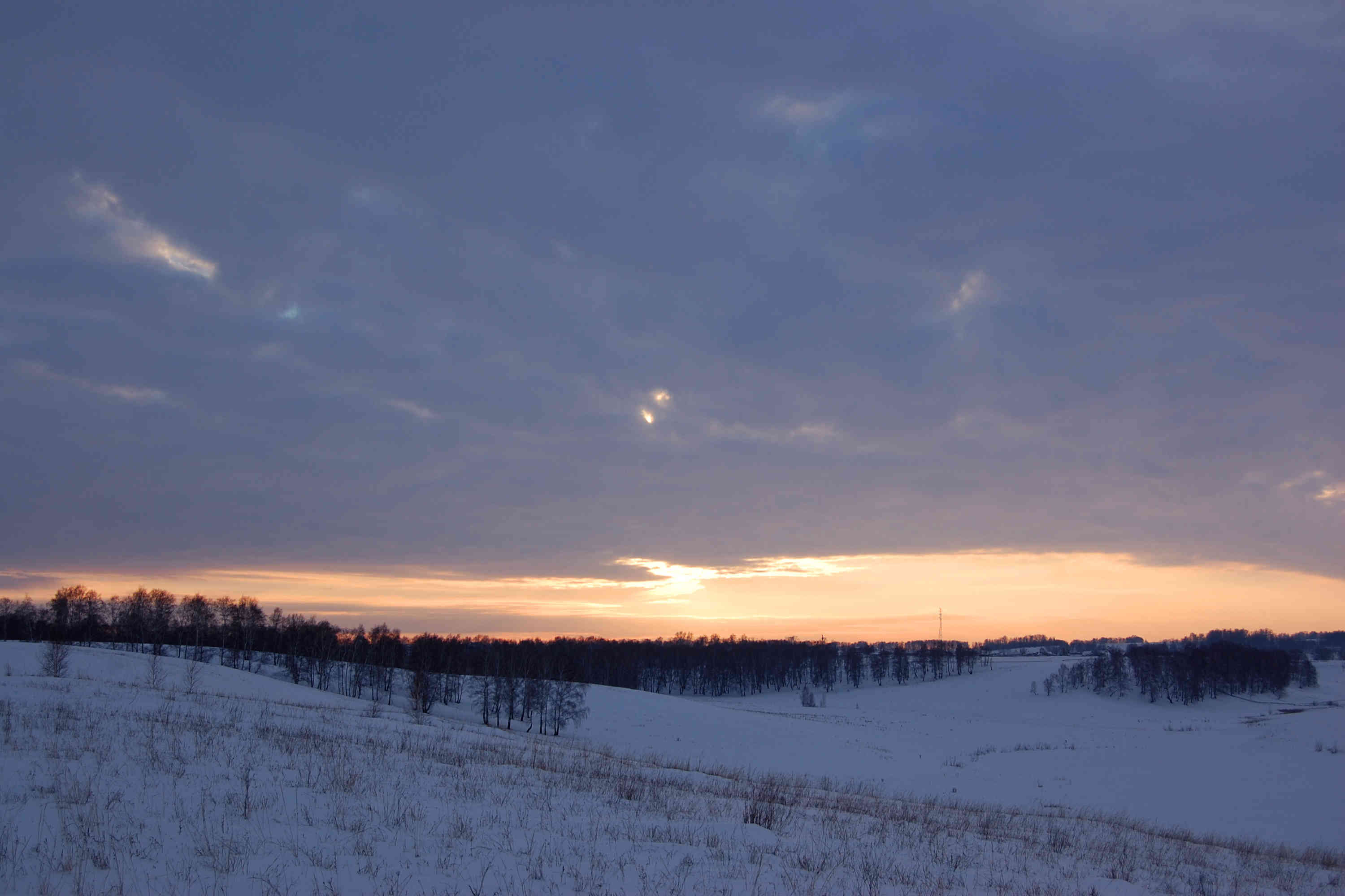 Твёрдый наст закончился после первой ЛЭП, на тех полях снег мягкий, а где не кошеная трава совсем глубокий пухляк, половину пути я ехал на пятках. Много полей со срезанным подсолнухом, знал бы - ракушку бы одел:) Очень весело мчаться по ним на скорости и распугивать птах характерным звоном:) Временами шёл снег, не значительно ухудшавший видимость. Видимость пропала, когда начали спускаться сумерки.