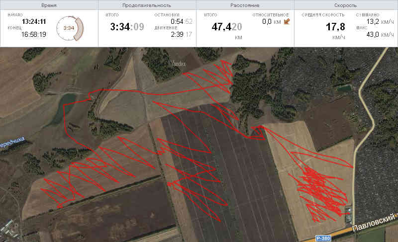 Управляющие стропы прошли в миллиметре от развесистых веток. Всё, выехал. Но и тут ещё рано было расслабляться, ветра то нет, а деревья впереди близко. Вымахал, вышел на поле, а оно не то - вот так сюрприз! То находилось за лесополосой выше по ветру. Ещё и кайт Карыча последний раз видел, когда въезжал в свою ловушку. Теперь по расчётам получалось, что он где-то впереди, но из-за взъёма его не видно. Поднялся на бугор - нет Алексея, объехал лесополосу и подошёл к месту нашей первой остановки - нет Алексея. Звоню - из трубки маты, но помощь не требуется. Вобщем, у него ветра тоже не было! Вымахал, встретились, поехали дальше.