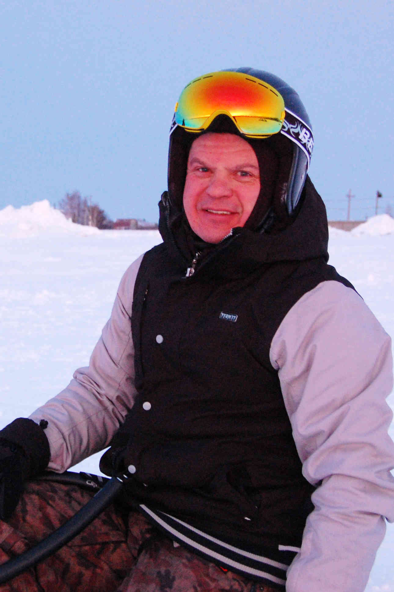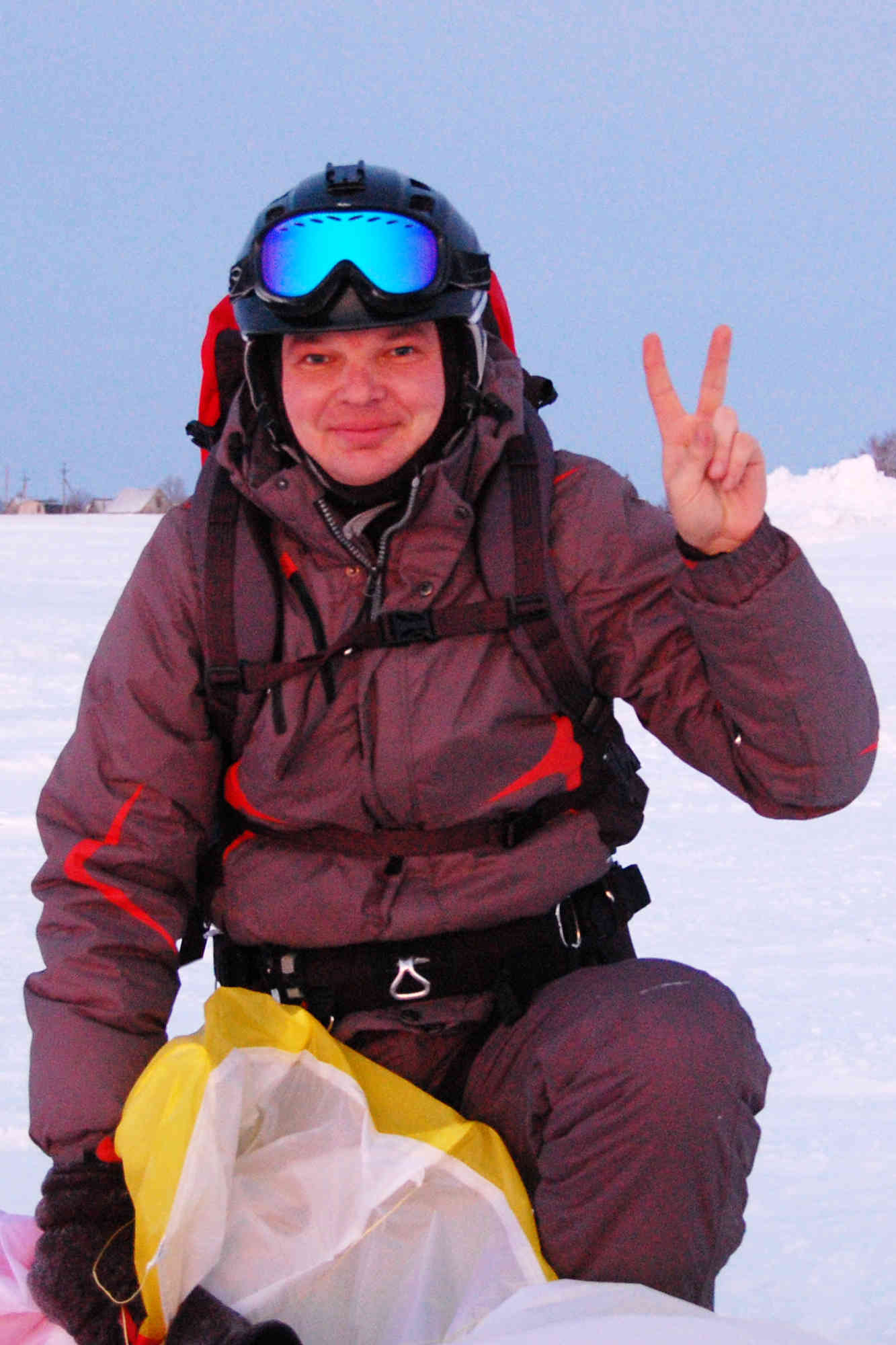 Потом у меня ещё были два завала купола на морду при прохождении двух крайних ЛЭП. То ли от усталости, то ли с непривычки от нового купола, а визуально Extazy-II 12 с его удлинением под проводами не проходит, и проверять это до миллиметра не очень-то хотелось. Под высоковольтной без проблем, прошёл не задевая земли, а под маленькими подгибал нижнее ухо об снег и два раза купол ложился на морду, но без дальнейших неудобств - поднял, развернул и дальше, время только терялось. А что время, когда перед глазами родные просторы - озеро со вторым знаком, холм, за ним впадина, а там подъём и третье поле. А ещё светло. На Берёзку прибыли в 16:30 с километражем 48,5 км, нас там ждали Виталя, Алексей и ДмитрийК. Ещё 4 км я накатал за получасовую заминку.