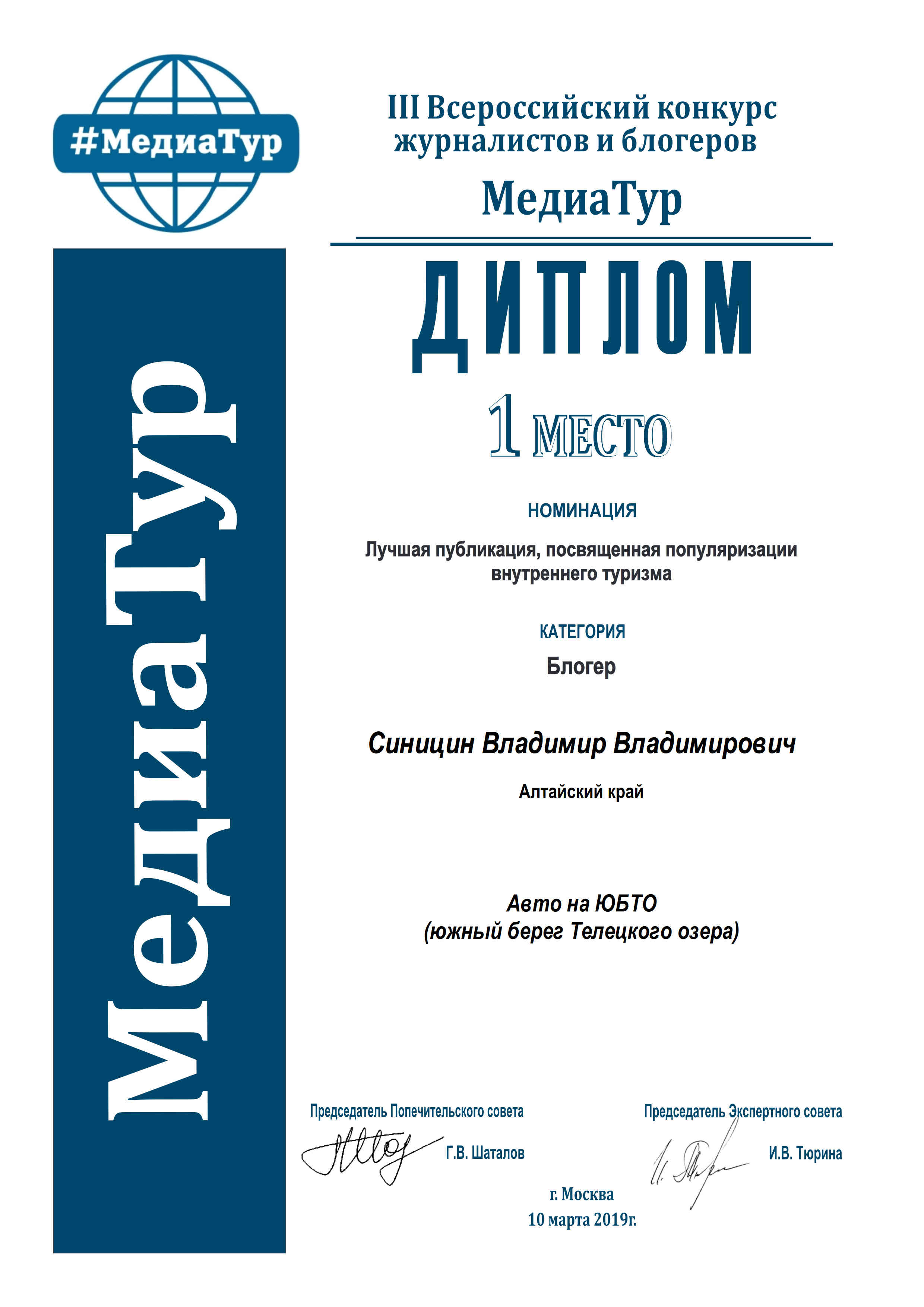Cтали известны результаты Всероссийского конкурса МедиТур, в котором рассказ Авто на ЮБТО (южный берег Телецкого озера) занял первое место в номинации Лучшая публикация, посвященная популяризации внутреннего туризма в категория: блогер: http://www.regionpr.ru/news.php?extend.3893