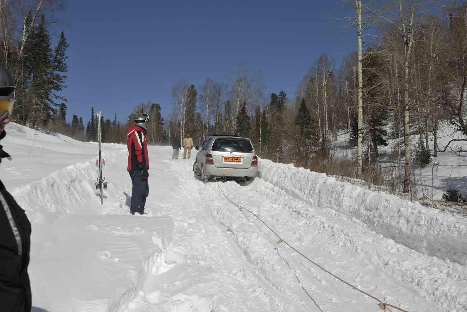 Мало того, что джипяра застрял, так за время благоустройства он ещё и примёрз. Операция по спасению началась с откапывания подвижных частей автомобиля. Пока Сан Саныч в образе заправского шамана махал лопатой вокруг своего джипа, Серёжа с Тимофеем уже привязывали канатом к фаркопу Делику. Первая попытка дернуть с успехом провалилась, Прадо покрутил колёсами, но с места двигаться отказался. Следующие действия спасителей напомнили русскую сказку про репку – "Позвал Дед Бабку...". Бабка явилась в образе 185-ти сильного внедорожника, который стал головой состава прадо-делика-прадо, и под громогласные команды бравого капитана Сергея, на раз-два состав тронулся в свой недалёкий путь в три метра. Добавив к этому расстоянию ещё метров тридцать, самые нетерпеливые из зевак великого спасения превращались в обыкновенных кайтеров, спешно расправляющих куполы и стропы на девственно-гладкой поверхности замёрзшего Телецкого озера.
