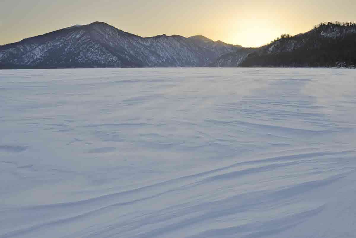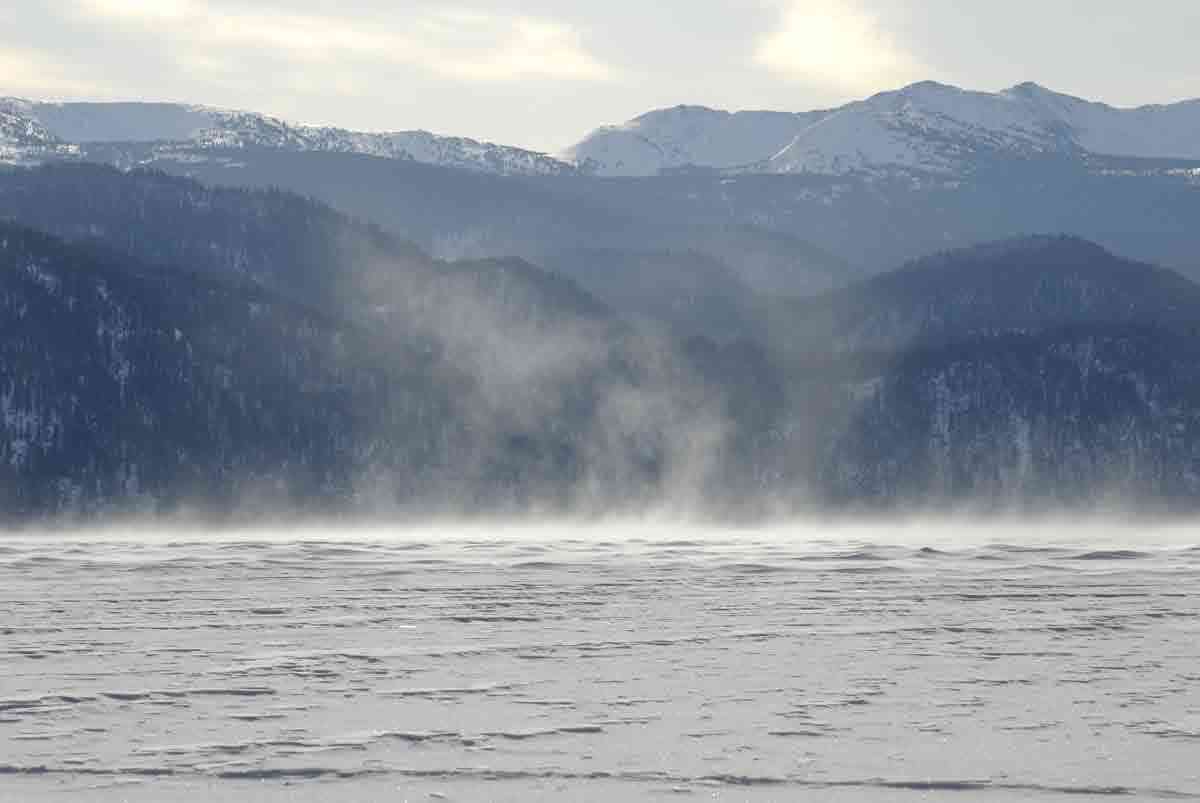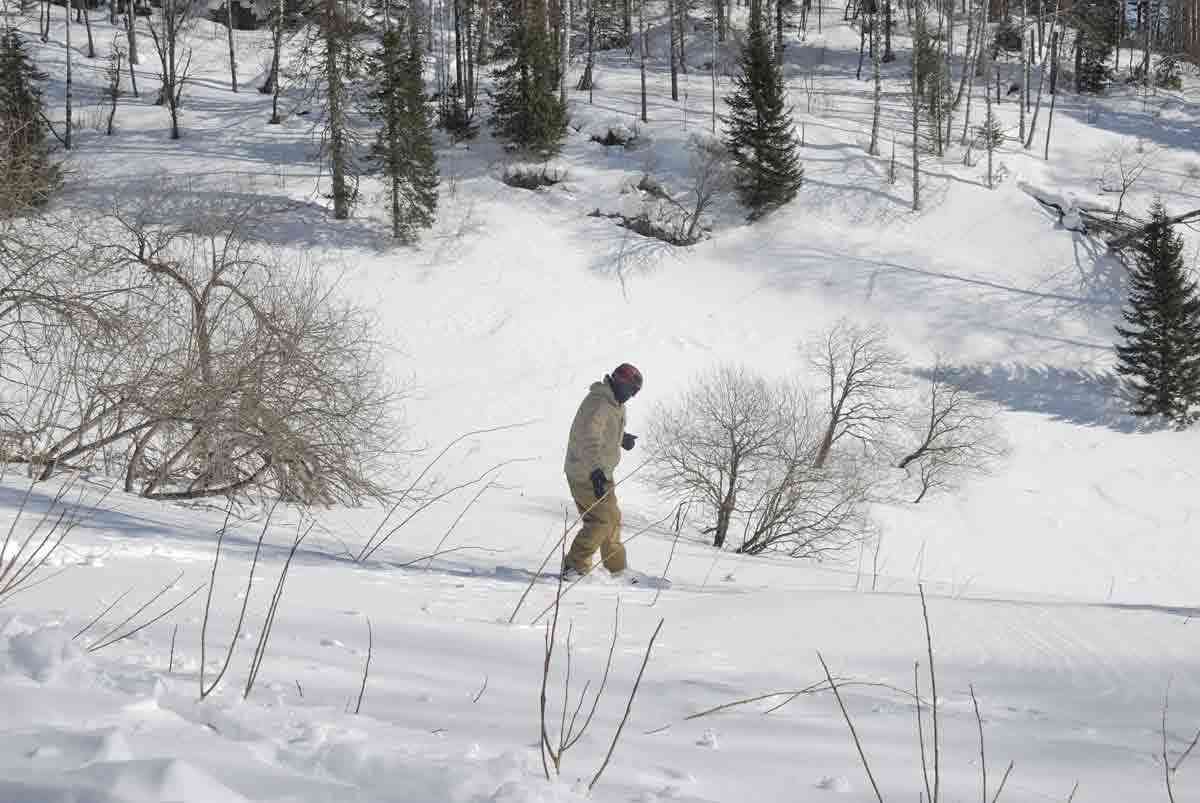 Погода и впрямь не обещала кайтерам ничего хорошего. Поверхность озера могла лишь представляться, спокойной гладью, лежащей под бушующим над ней штормом. Чтобы проносящиеся клубы снега не нагоняли в душу тоску, мы весело запрягли Клюгера в горнолыжно-подъёмную упряжь на семь персон плюс сидячие места в салоне и отправились наверх. До вершины не доехали из-за пузотёрки буксующей в перемёте. Попытки помочь не увенчались успехом, машина стала разворачиваться в Яйлю, а мы, не теряя времени, рванули вниз. Охранник на заставе только успевал открывать шлагбаум перед проносящимися мимо него горнолыжниками и сноубордистами. Люди катились на перегонки, прыгали по обочине, зарываясь в пухляк. Эта чехарда придала такой заряд бодрости, что было решено подняться ещё раз и спуститься по логу, уходящему к деревне. Словно сёрфы скользящие по волнам, борды плыли по мягкому снежку меж кустов и деревьев. Плыли до первой равнины, далее пришлось выгребать руками, лёжа животом на доске. Потратив достаточно времени на преодоление лесной опушки, искатели приключений на свою опу рухнули по крутому склону в деревню и оказались за обеденным столом.
