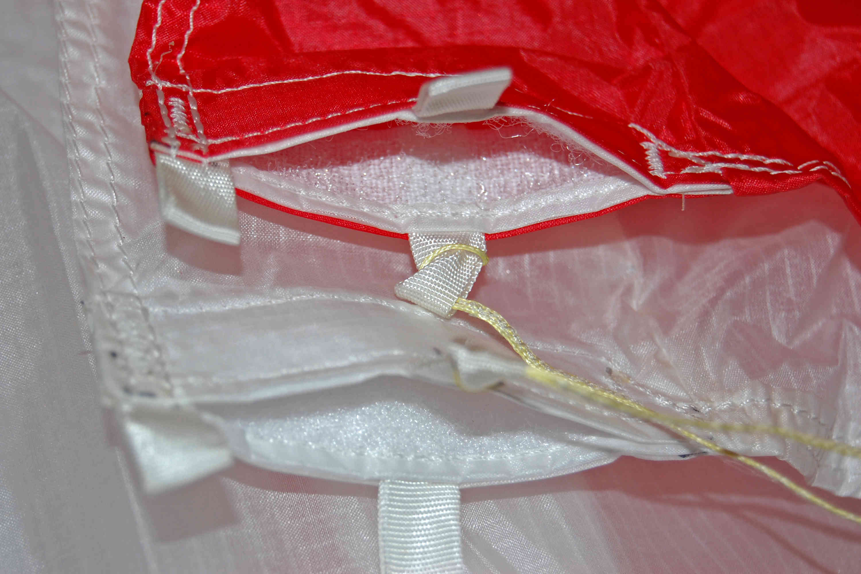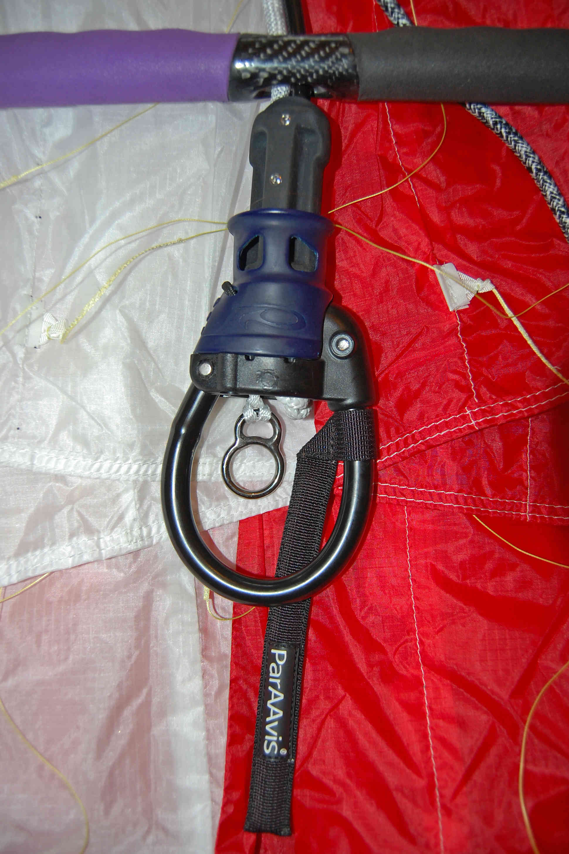 Зря заморочились переделкой. В реальности, при работе страховки, кайт тянет через 5-ю стропу за другую сторону этой резинки, и она проходит через отверстие в планке в НАТЯНУТОМ состоянии, не образуя никаких складок на оплетке.