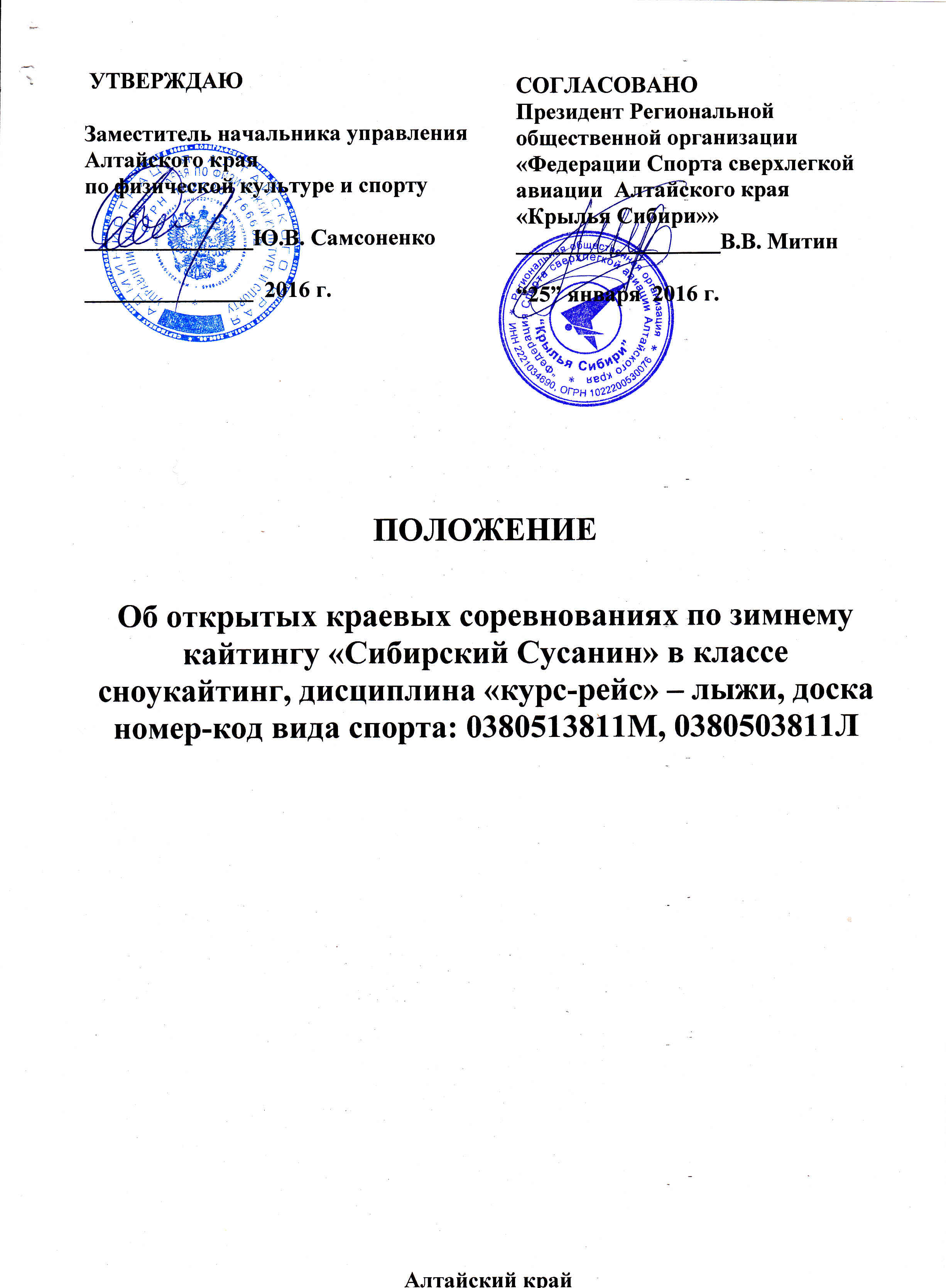 Об открытых краевых соревнованиях по зимнему кайтингу «Сибирский Сусанин» в классе сноукайтинг, дисциплина «курс-рейс» – лыжи, доска номер-код вида спорта: 0380513811М, 0380503811Л