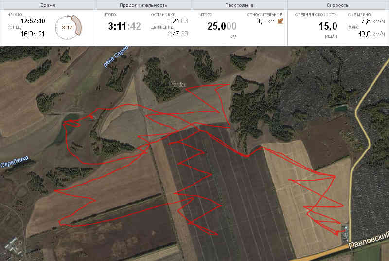 Первый рабочий день можно сказать удался. Не так, как первый день отпуска конечно, но всё же. Сегодня ветер был пограничный слабый, в отличие от прогноза. Он был такой, что с первого знака я не захотел ехать на девятый, а поехал на базу, заехав попутно на шестой знак. И на шестом как-то так оптимистично подуло, что я вернулся к первоначальному плану на день - пройти все знаки. Вернулся на девятый, оттуда на озеро (на этом спуске 49 км/ч и получилось), а на озере - ти-ши-на! Ну т.е. кайт не летает. Подумал, что пешком идти рано, надо пить чай. К концу чаепития чуть-чуть повеяло, позвонил на работу, узнал - как там флаг на Драме? Ответили: "Шевелится бодро". Екстазик тоже взлетел и немного потянул, так я ушёл на восьмой знак, а оттуда в общем-то без проблем пробился через лог к третьему полю, а там и дом рядом. Первое поле видимо хорошо укатано, т.к. дуло везде одинаково слабо, но на первом поле махать кайтом не приходилось, а как доехал, ветер стих. Пили чай, разговаривали, смотали кайты и домой. Итого пройдено 25 км и взяты все знаки, пешком ходить не пришлось. Теперь можно и поработать.