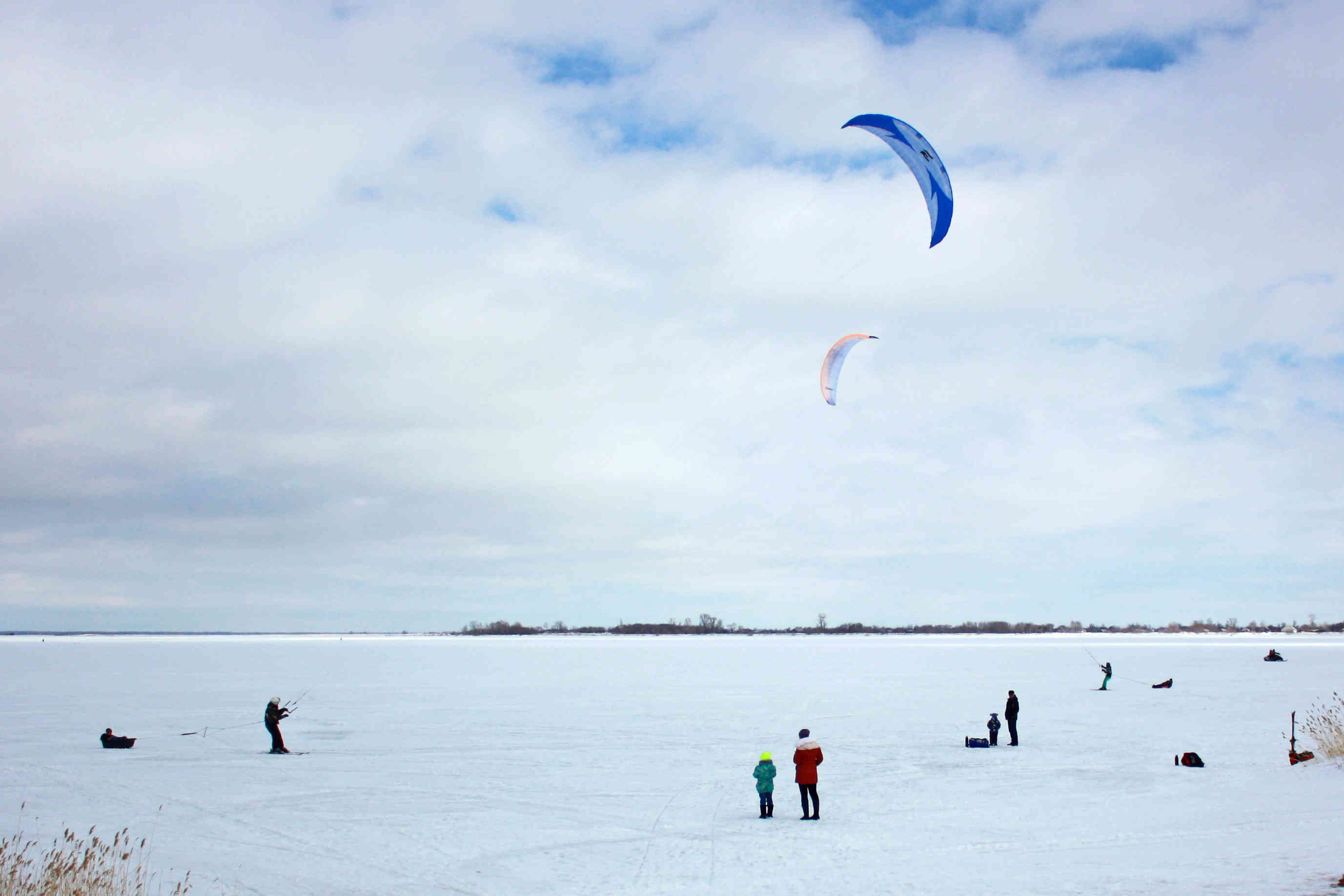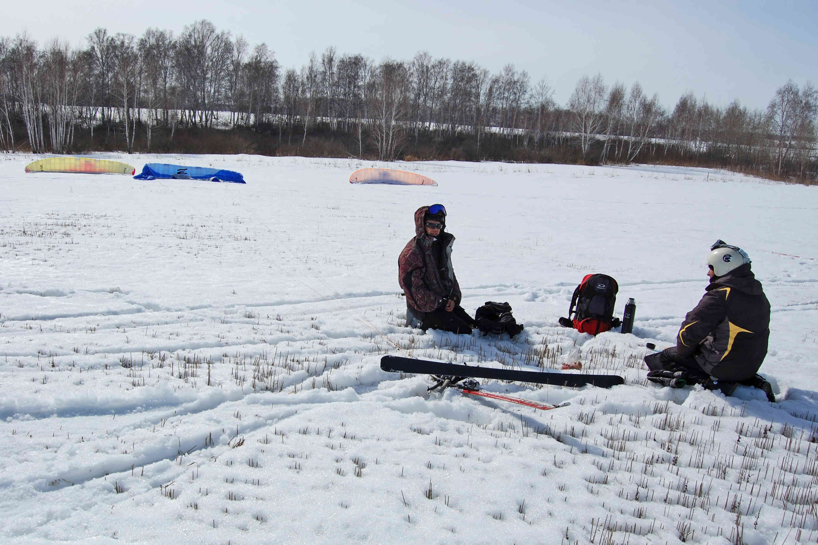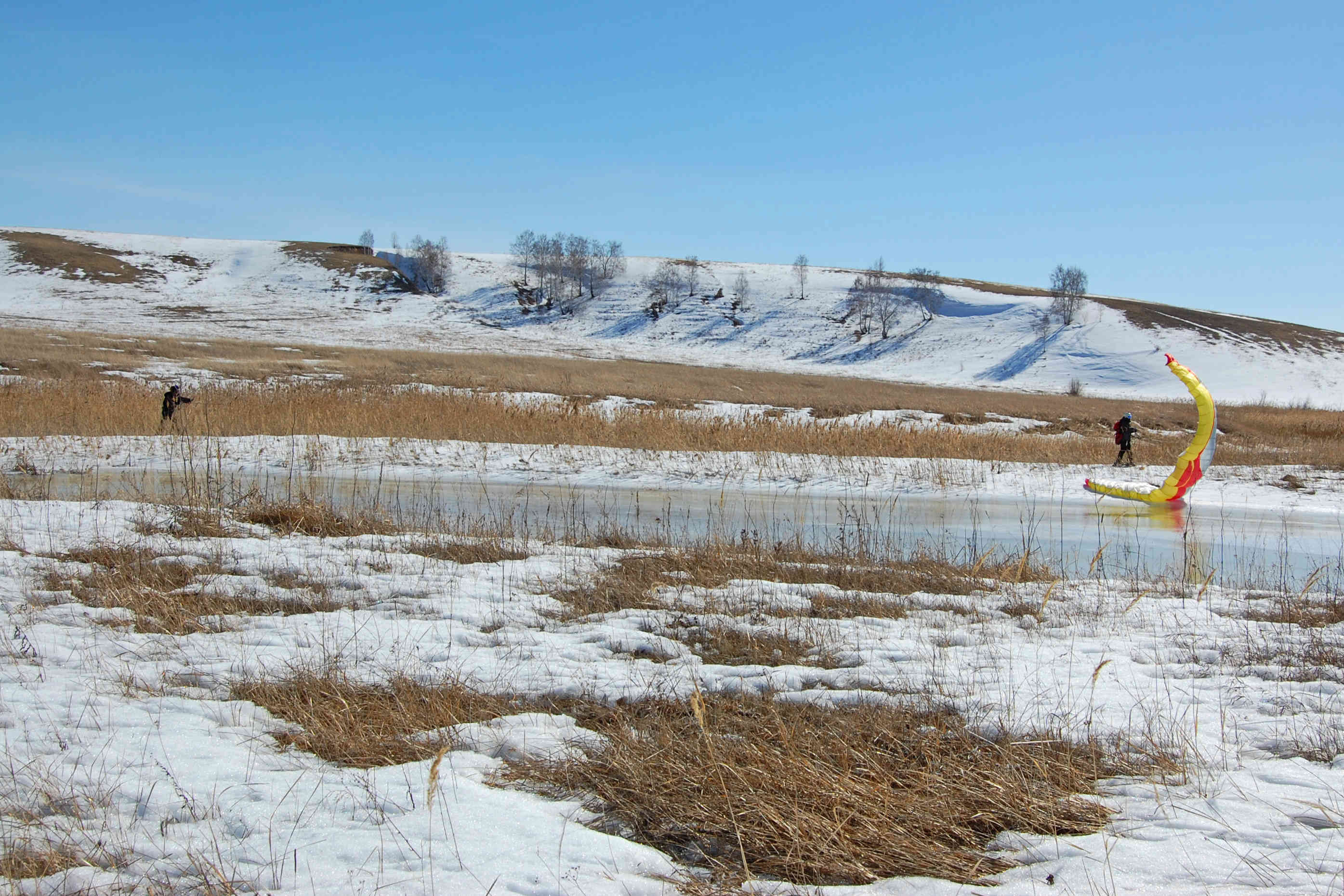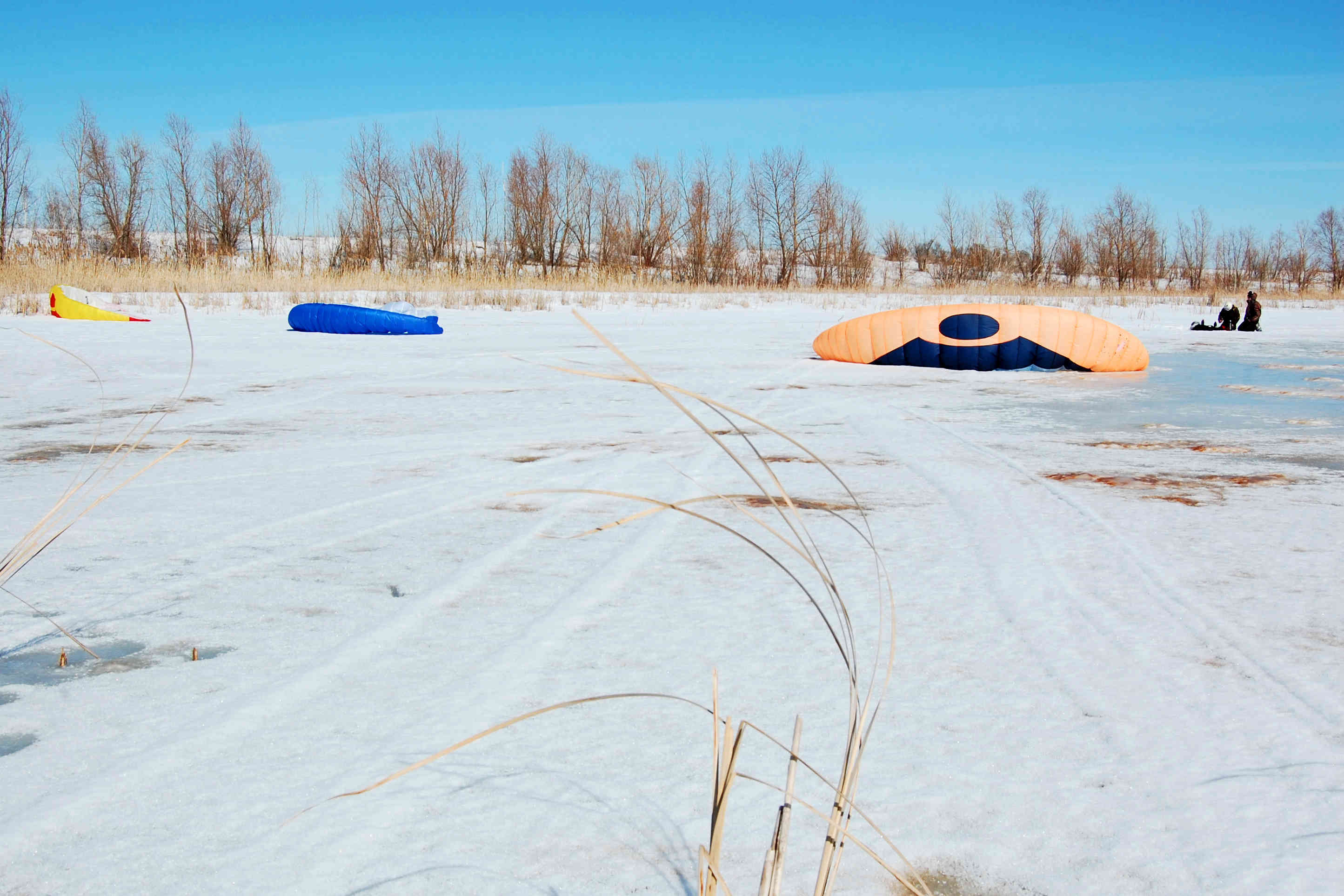 Ветер так же слаб относительно прогноза. В небе 11 и 12 размеры, дует иногда погранично, чтобы не затягивать триммер. Для разминки скатались от берега до берега. Рыбаки рыбачат, солнце светит, снежок блестит - красота! По мере того, как восходит солнце, становится тепло, но на льду дорога не расквашивается, а на берегу заметно увеличиваются проплешены. Но это не мешает ездить там, где хочется - и по озеру, и по берегу, и через камыши!