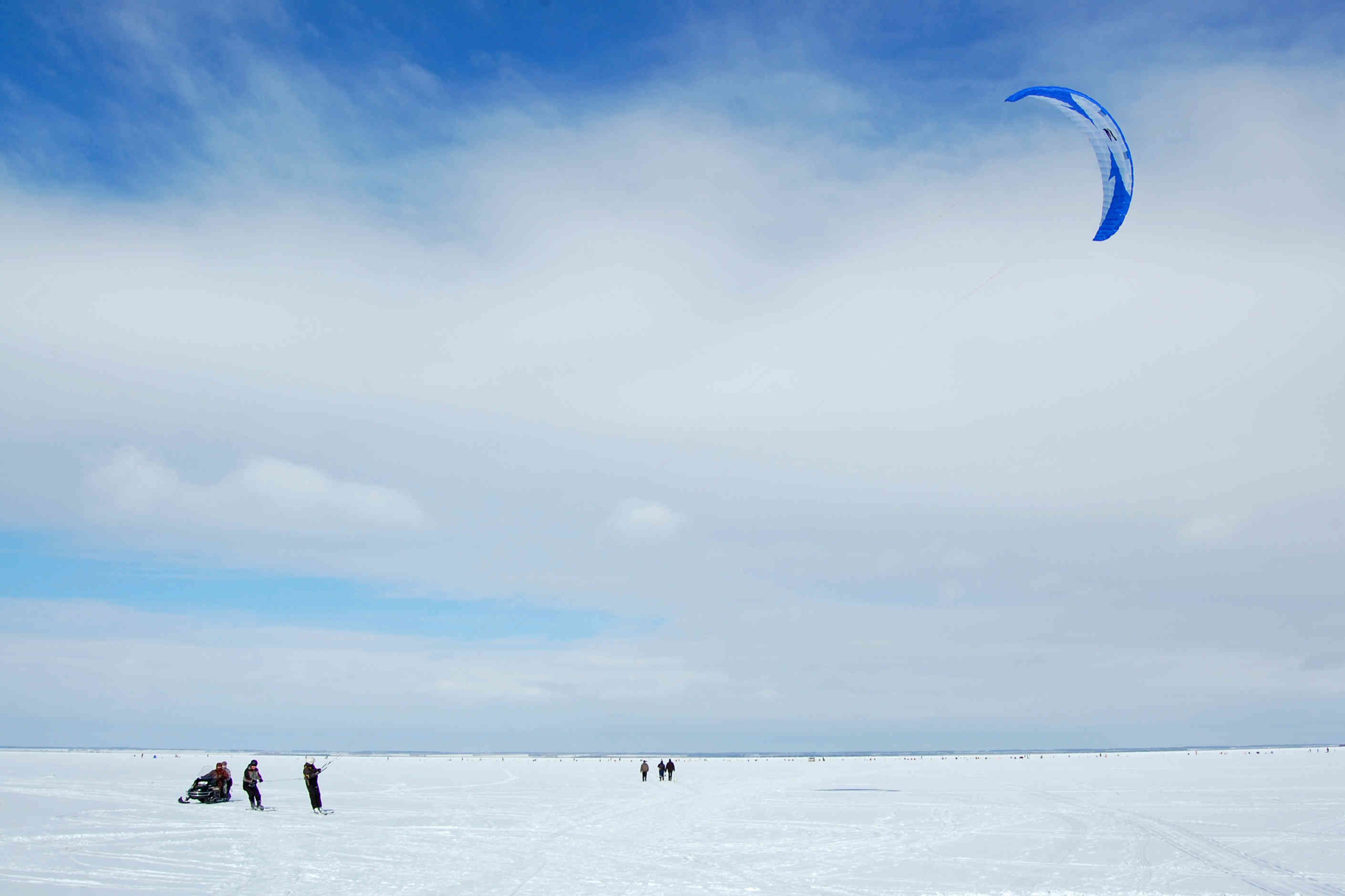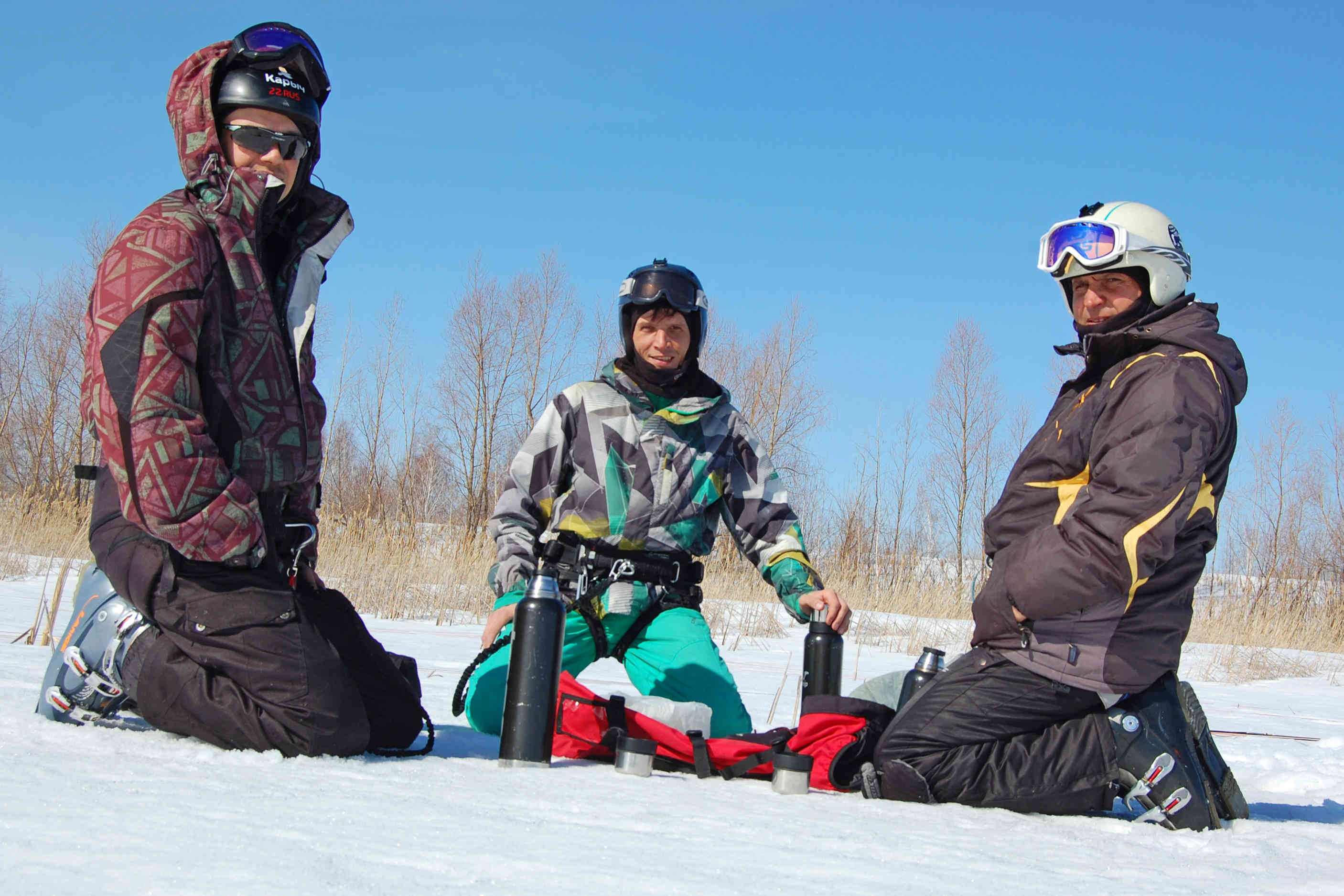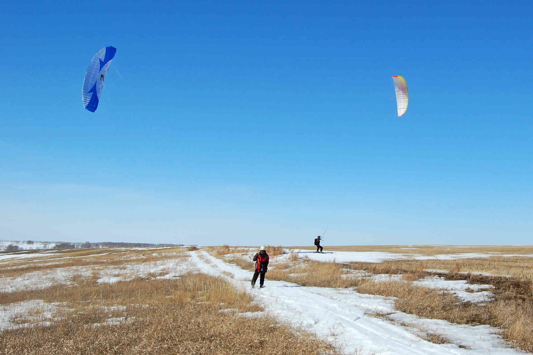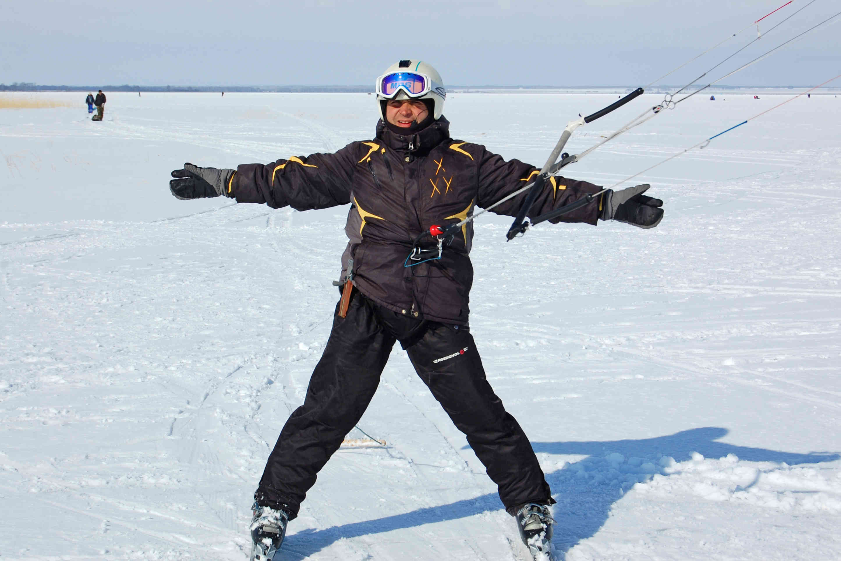 Ветер так же слаб относительно прогноза. В небе 11 и 12 размеры, дует иногда погранично, чтобы не затягивать триммер. Для разминки скатались от берега до берега. Рыбаки рыбачат, солнце светит, снежок блестит - красота! По мере того, как восходит солнце, становится тепло, но на льду дорога не расквашивается, а на берегу заметно увеличиваются проплешены. Но это не мешает ездить там, где хочется - и по озеру, и по берегу, и через камыши!