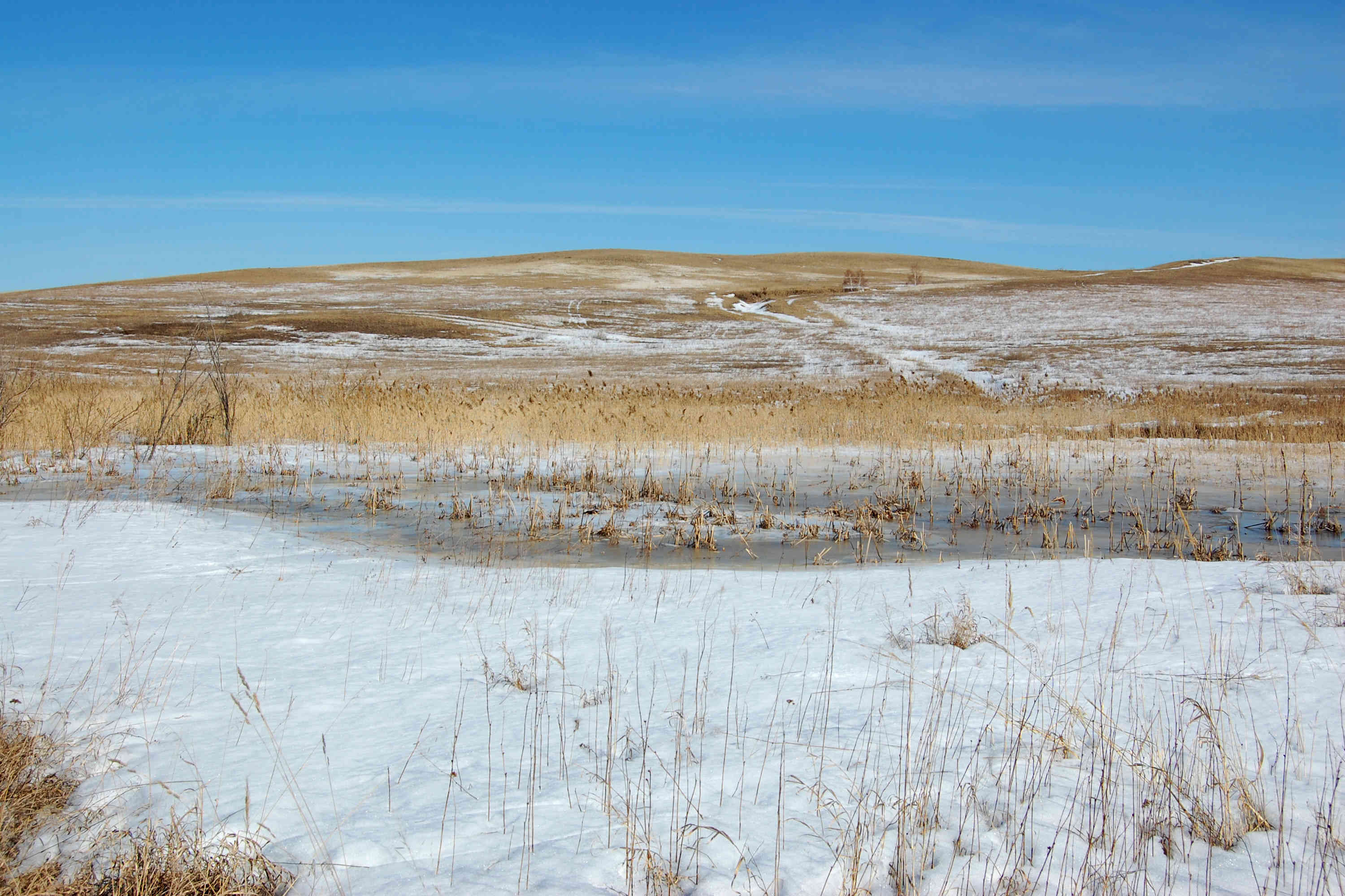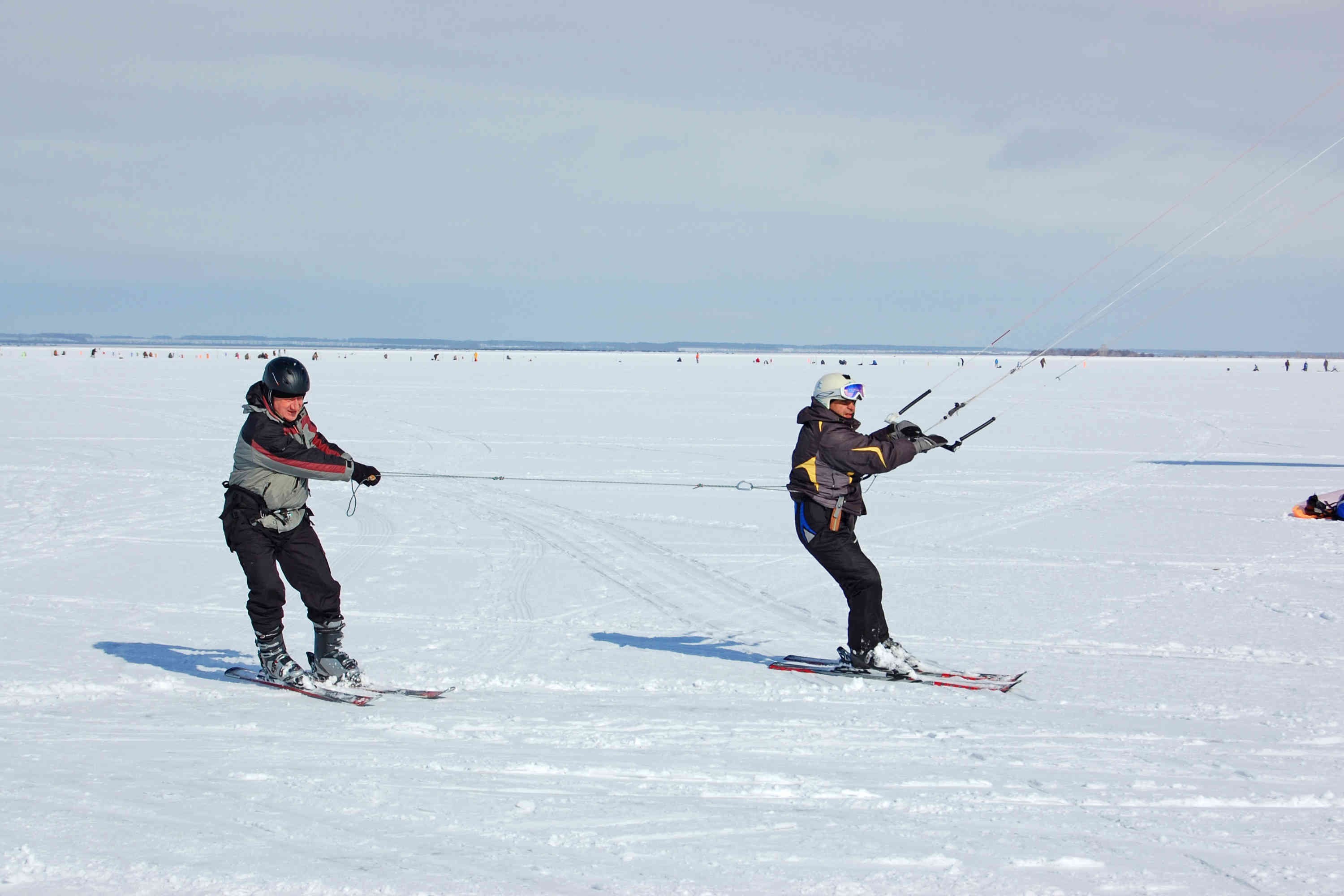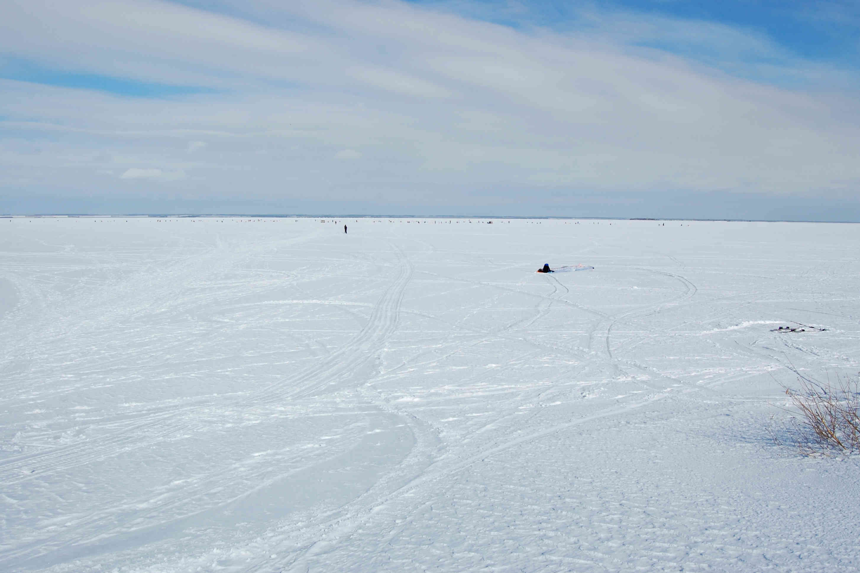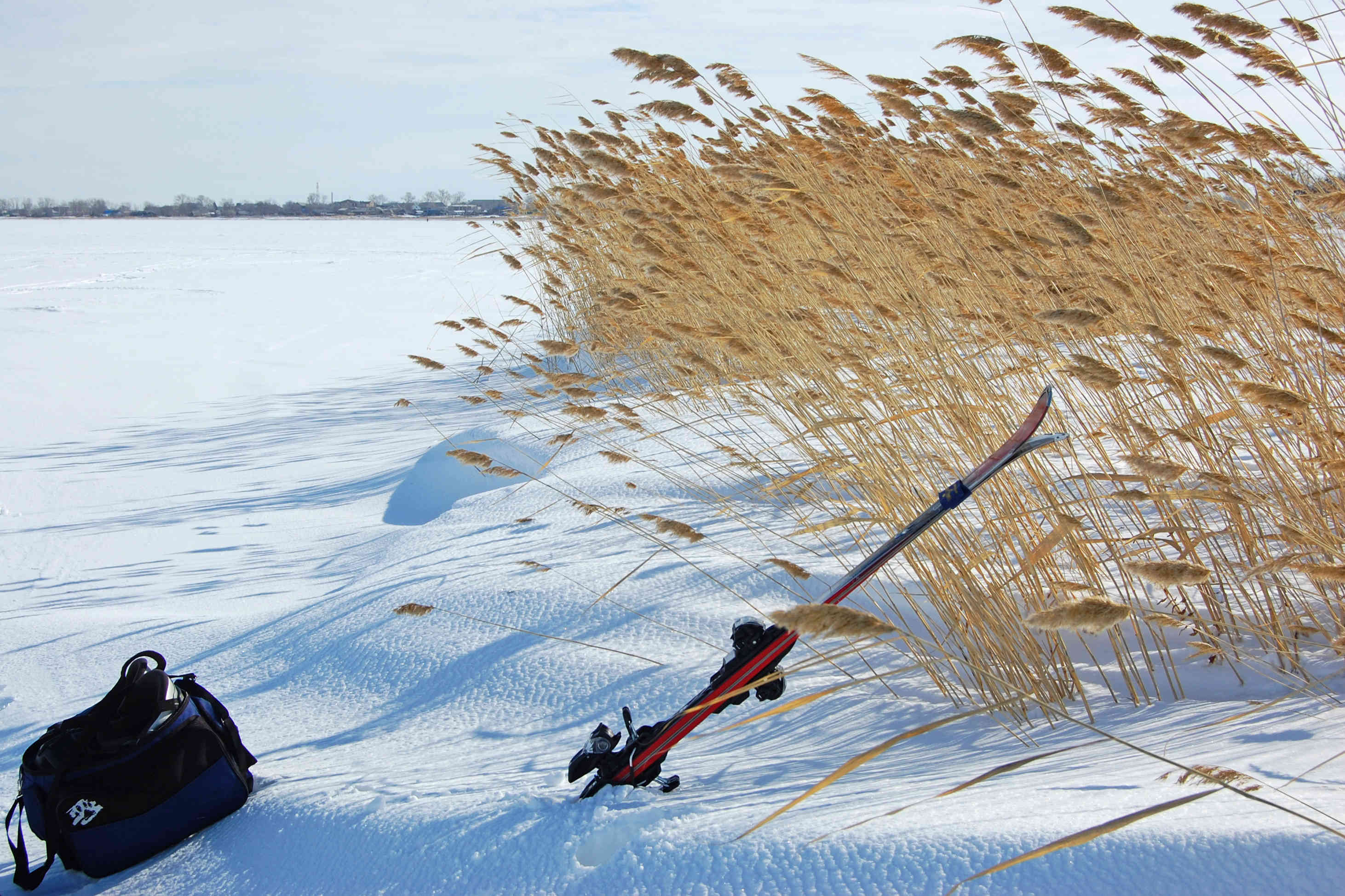 Ветер так же слаб относительно прогноза. В небе 11 и 12 размеры, дует иногда погранично, чтобы не затягивать триммер. Для разминки скатались от берега до берега. Рыбаки рыбачат, солнце светит, снежок блестит - красота! По мере того, как восходит солнце, становится тепло, но на льду дорога не расквашивается, а на берегу заметно увеличиваются проплешены. Но это не мешает ездить там, где хочется - и по озеру, и по берегу, и через камыши!