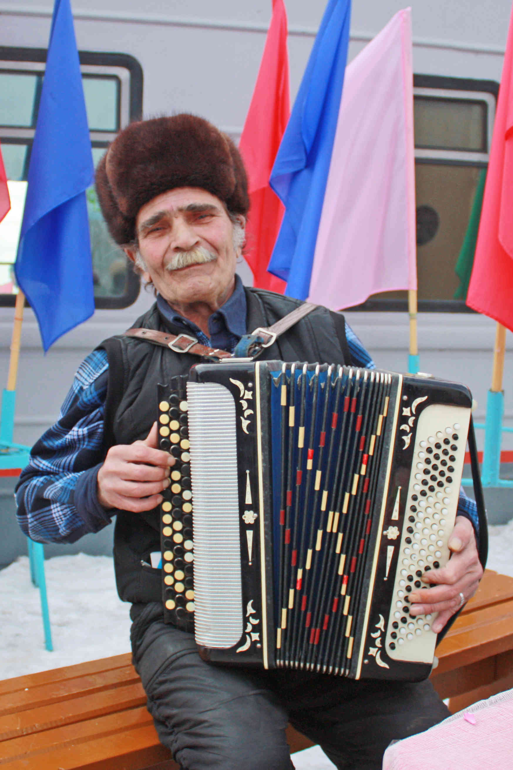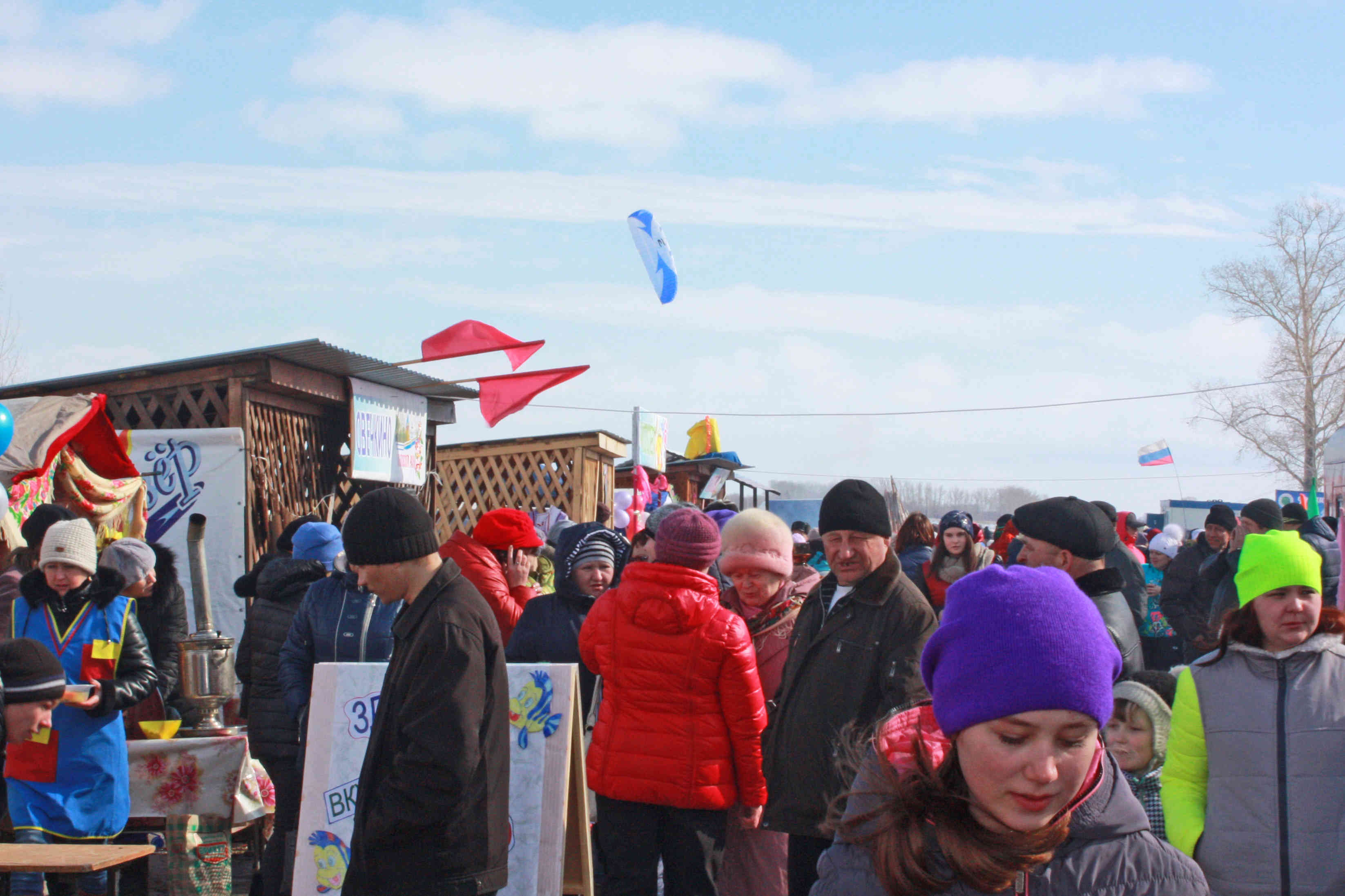 А за окном вагона реяли праздничные флаги и было ещё достаточно светло! Поэтому, как надо подкрепившись, мы пошли за кайтами. Разложили их тут же возле вагона и по расчищенной дороге докатились сто метров до озера. Поверхность льда гладкая, присыпанная свежевыпавшим снежком. Ветер не по прогнозу слаб (а прогноз то был ого-го! Когда ехали, снег переметал Завьяловскую трассу), но его хватает, чтобы легко гонять на 7 и 8 размерах. На этом ветре мы покружили возле базы, я сгонял в Харитоново, в общем - всё скользит и едет, день закончился приятно.