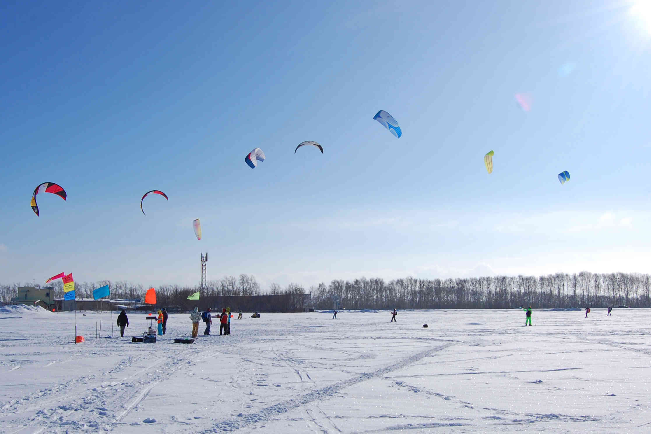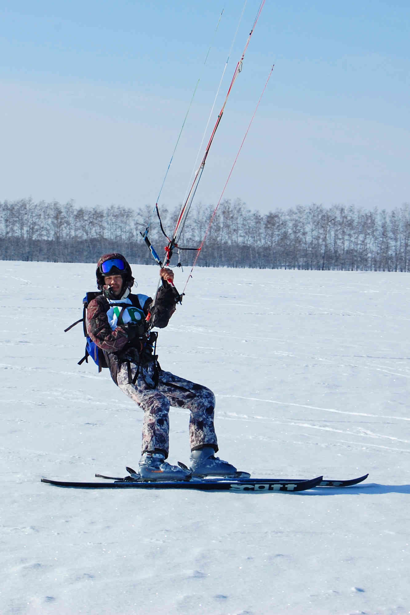 Стартовал в первой гонке как обычно "только после вас". Потихоньку доскребся до района 6 знака (с втыканием головой в снег на полном ходу), и здесь меня начало просто сдувать. Купол в зените, упираюсь, а меня все равно несет в лес. Пришлось свернуться и пешкодралить назад. В конце первой лесополосы стал в засаду, где и поснимал видео. Перед 3 гонкой опять дошел на кайте до этого места, опять поснимал.