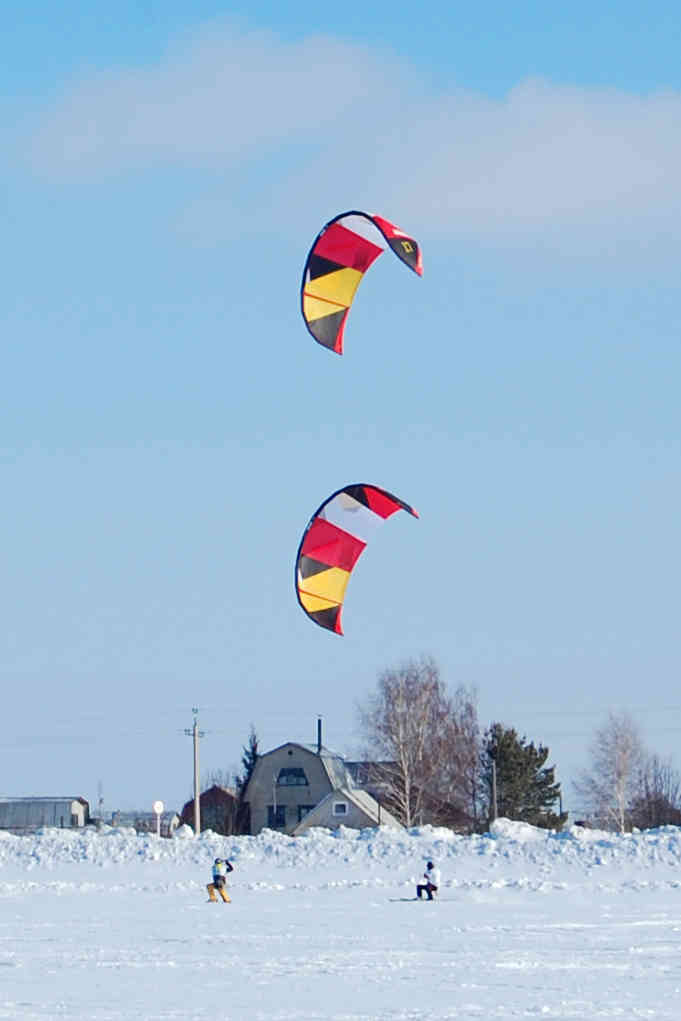 Но больше всего понравилась первая гонка на второй день. Иду всю дорогу первый на хвосте висят трое, ближе всех Корчагин и вот беру 6-й знак оборачиваюсь, а Корчагина нет. Неужели закис где-то думаю, да вроде не видно нигде. Ладно, ломлю домой - на обратном пути еще 3 знака надо взять. Впереди за березами мелькает его купол, елки-палки почему он ушел, мысль сидит гвоздем в мозгу. И тут ловим закисон - я и Тимка с Андреем позади меня. Я прикинул, ну тут примерно 1 км оставшиеся знаки собрать, чем с кайтом бегать так лучше сразу за знаками. Кайт в рюкзак запихал и чюхнул. Ну а как к финишу дошел (причем Тимоха с Андреем кайты все-таки потом запустили и доехали, все примерно в одно время) оказалось что Леха Корчагин уже 3-ю кружечку кофию допивает нас выжидаючи. И все - финиш уже закрыт, о как! Он, подлец такой, взял все знаки по дороге туда, догнал меня еще умудрился и сидел себе на хвосте спокойненько. А потом хлоп, и привез себе 1й приход, а всему остальному флоту по баранке каждому. Ай молодеса! Вот это была чистая тактическая победа, потому как все остальные неправильно походили.